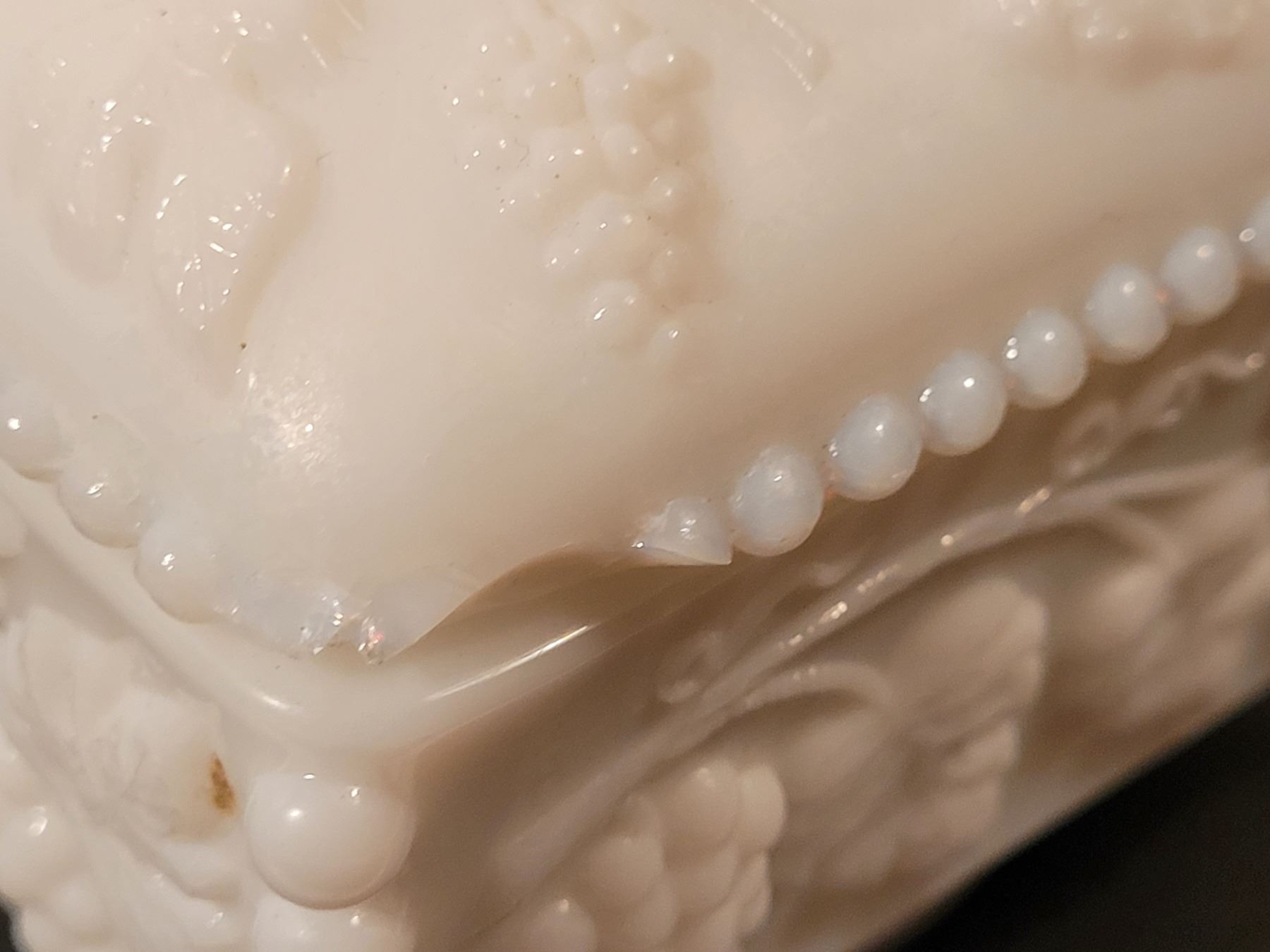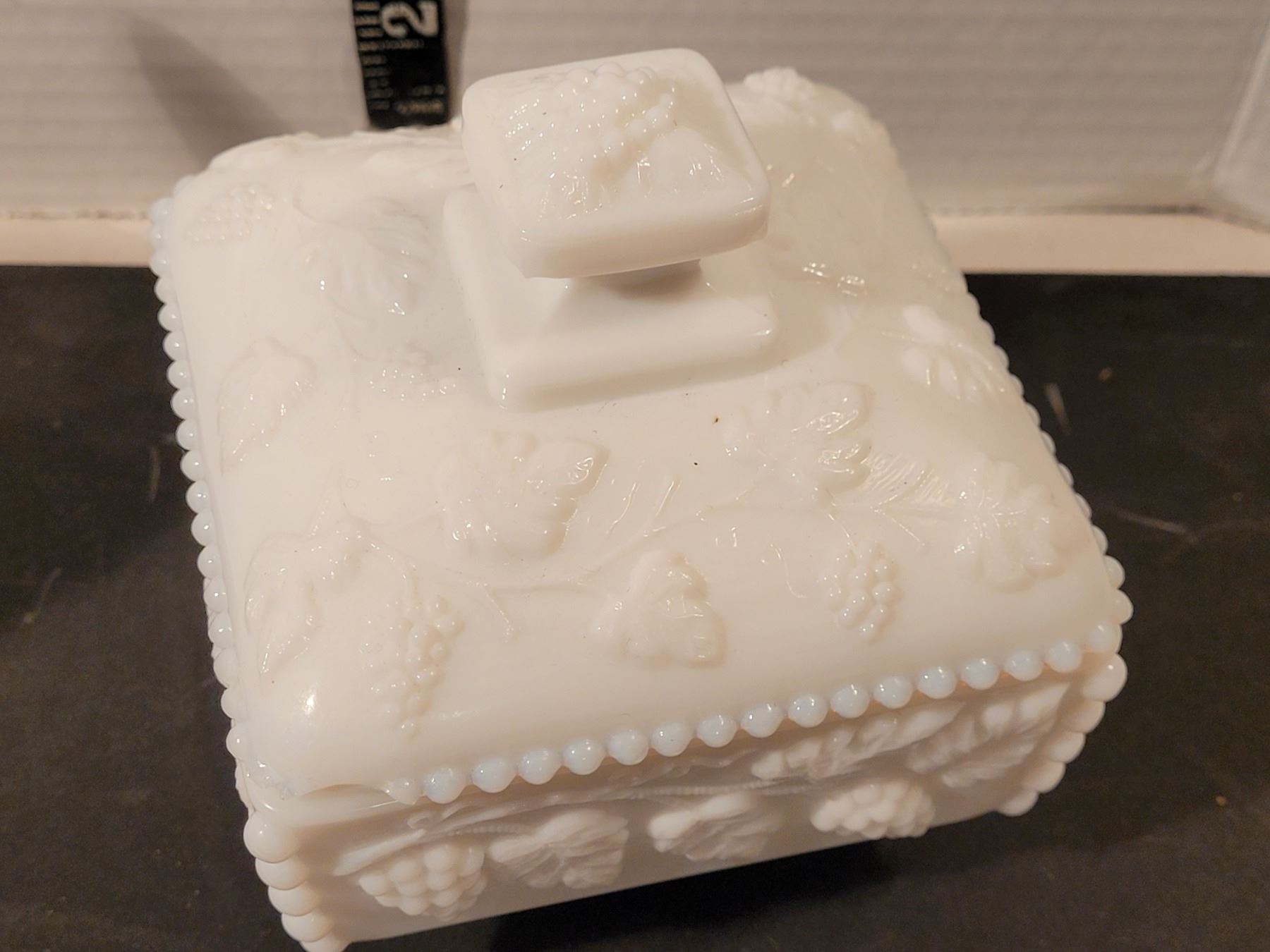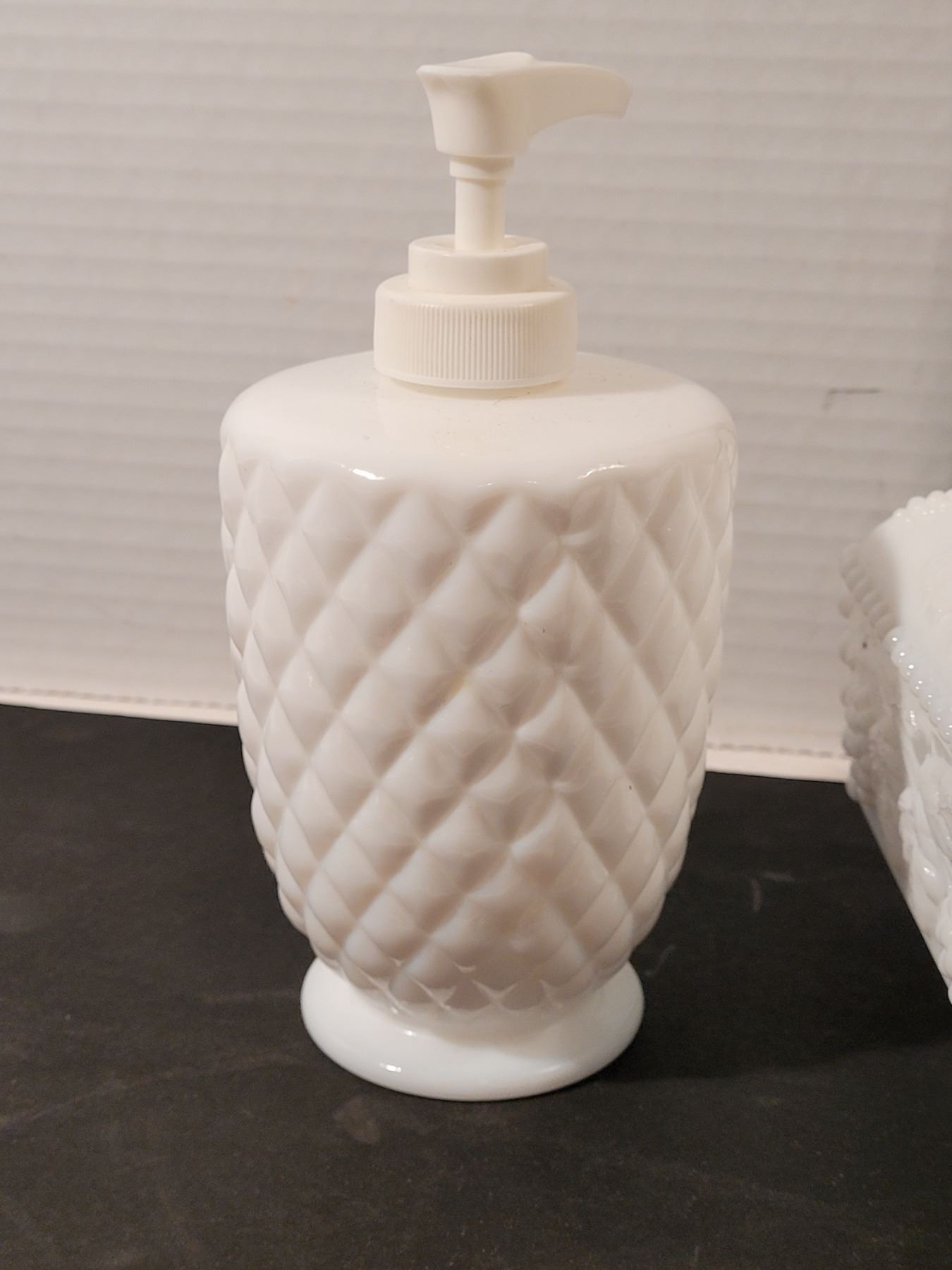 Milk glass lidded grape design dish (chipped corner) & lotion pump.