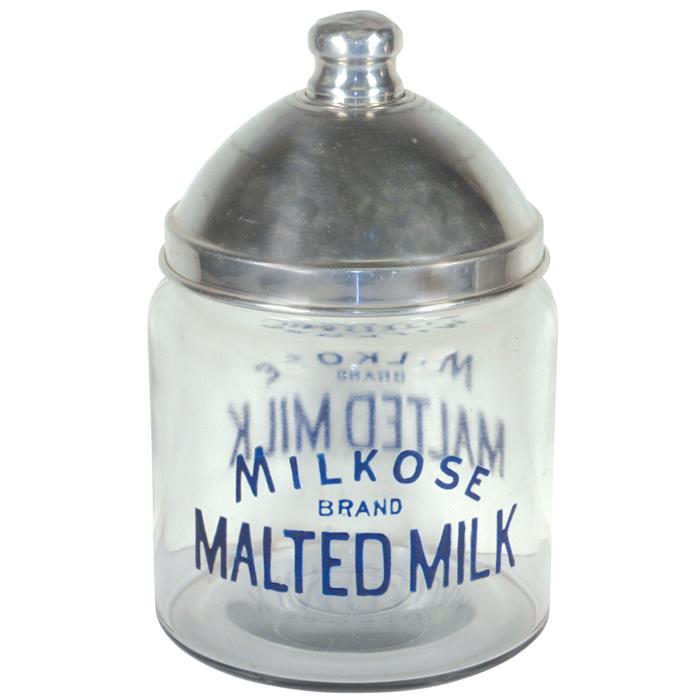 Milkose Malted Milk container, heavy clear glass canister w/enameled adv & domed metal lid, Exc cond, 9"H.
