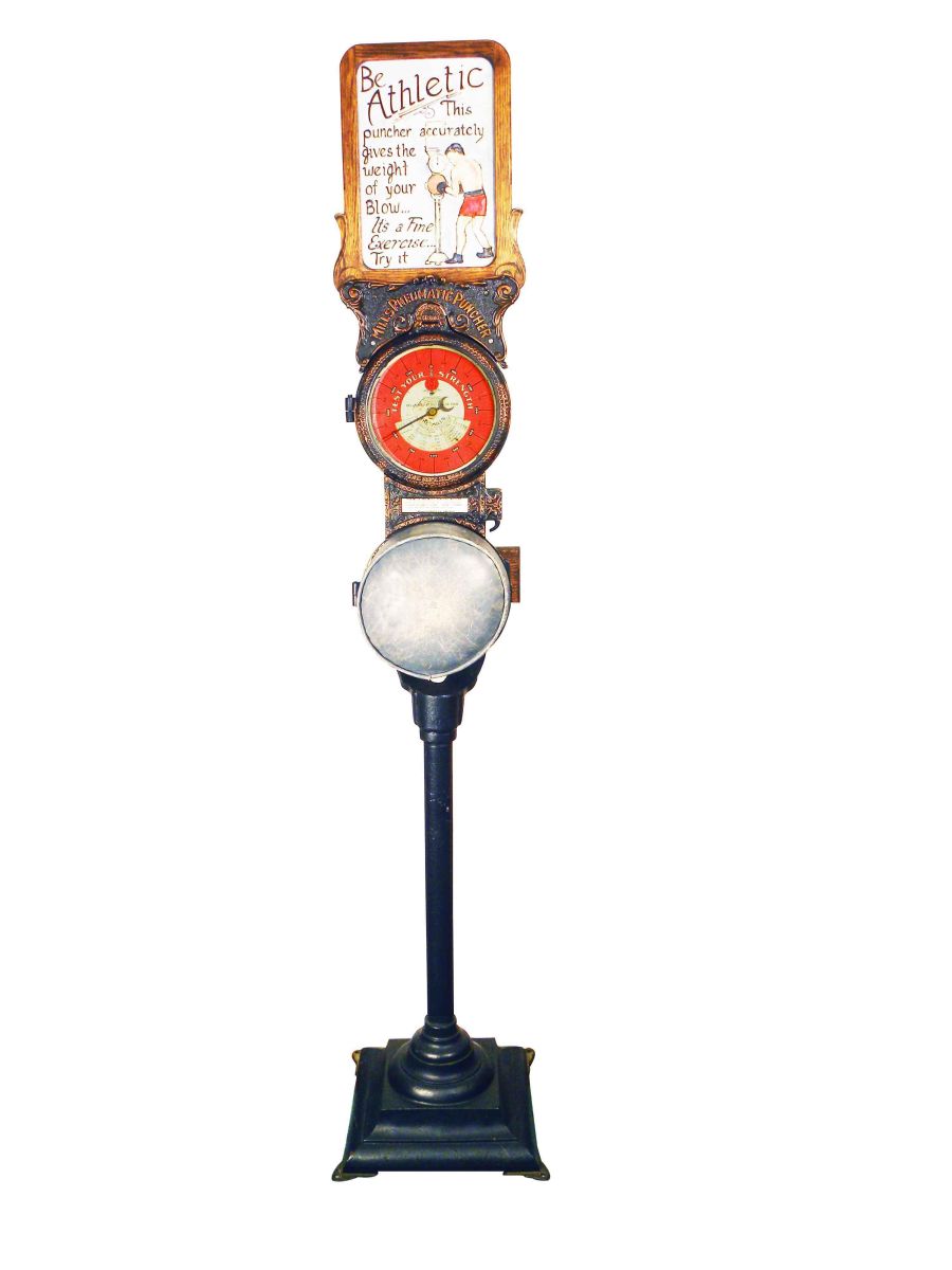 Mill's "Be Athletic" Pneumatic Punching Machine. Cracked right front corner on cast base otherwise excellent working condition. 18 X 89 X 20 inches.