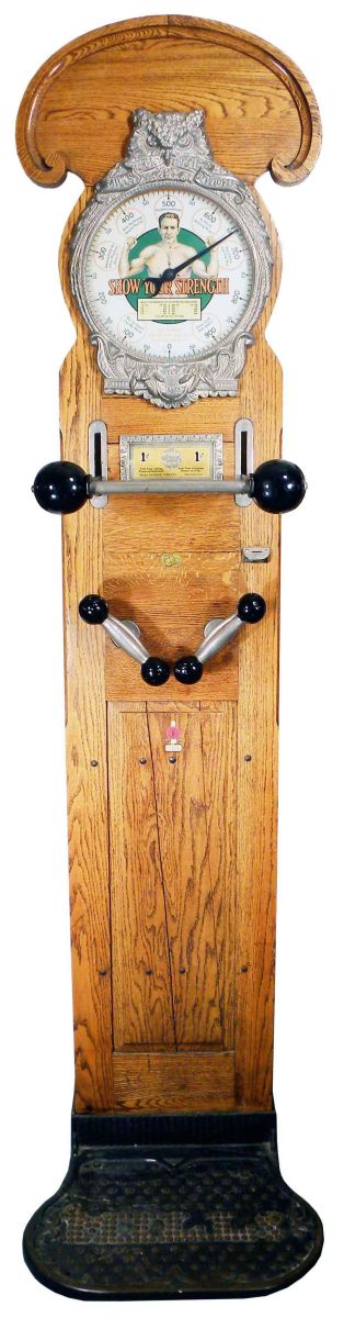 Mill's Perfect Muscle Developer. Barbell twist machine. Mills Novelty Co., Chicago, IL. Excellent working condition. No lock in back plate, comes with key to coin box. 25 X 95 X 30 inches.