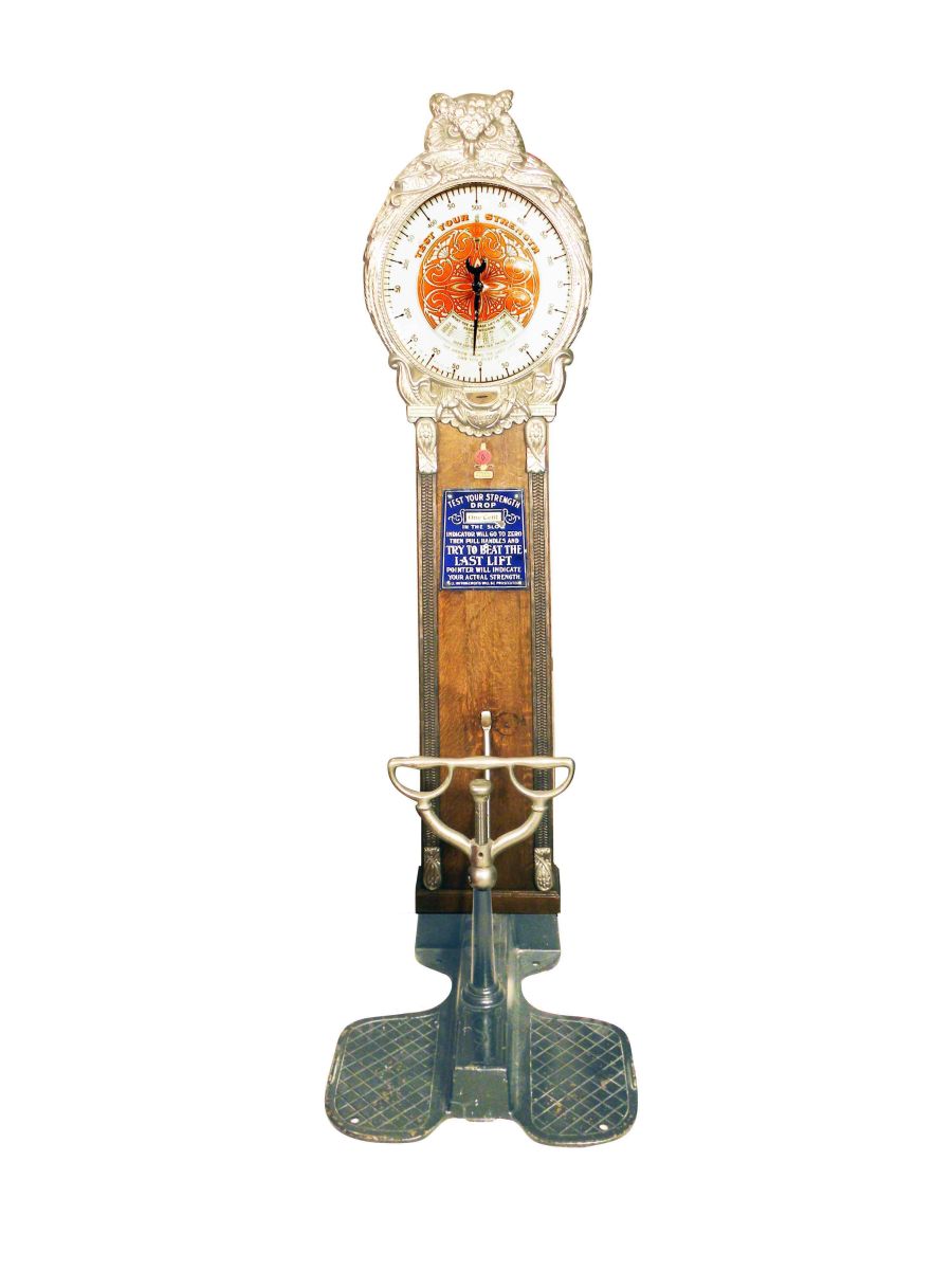 Mill's Perfect Muscle Developer, "Test your strength", coin operated. Mills Novelty Co., Chicago, IL. Excellent working condition. Comes with key for machine and coin box. 21 X 66 X 26 inches.