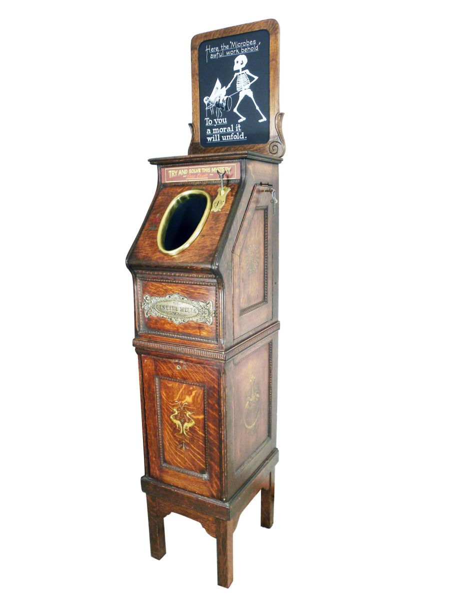 Mill's "Try and solve the Mystery", coin operated one cent. Mills Novelty Co. illusion machine. Excellent working condition. Comes with key for machine and key box. 14 X 77 X 18 1/2 inches w/marquee.
