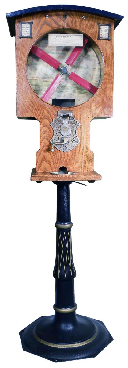 Mill's Windmill Gum coin operated penny fan. Very good working condition. 18 1/2 X 57 1/2 X 13 1/2 inches.