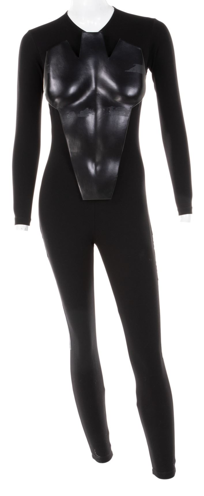 414. Milla Jovovitch "Alice" bodysuit from Resident Evil: Afterlife.(Screen Gems, 2010) Original black matte spandex collarless jumpsuit with leather chest plate affixed to front with heavy duty snaps, faux leather stripes down sides of legs, and zipper back closure. Exhibiting surface loss on leather chest plate from removed strips of black tape present in film. In very good condition. $1,000 - $1,500