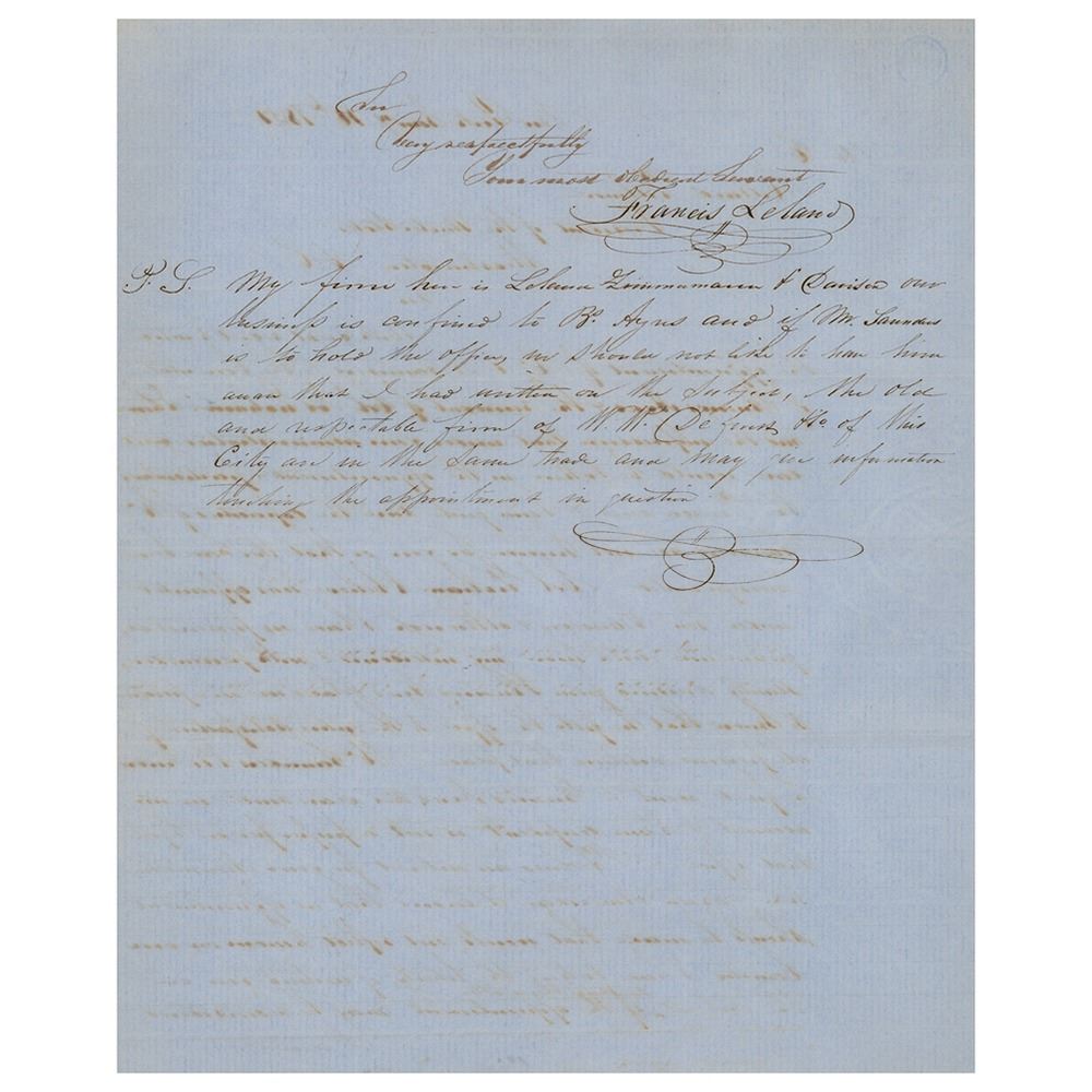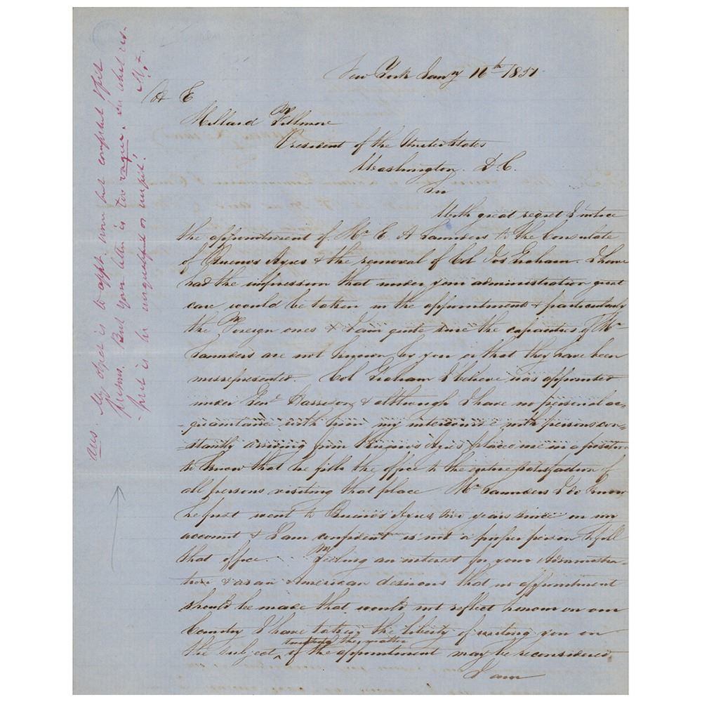 Autograph endorsement signed as president with his initials, "M. F.," in the margin of a letter written to him by Francis Leland, one page both sides, 7.75 x 10, January 16, 1851. Leland complains of the recent appointment of "Mr. E. A. Saunders to the Consulate of Buenos Aires & the removal of Col. Jos. Graham." Fillmore writes, in full: "Ans. My object is to appt. none but competent & fit persons. But your letter is too vague. In what respect is he unqualified or unfit?" In fine condition.