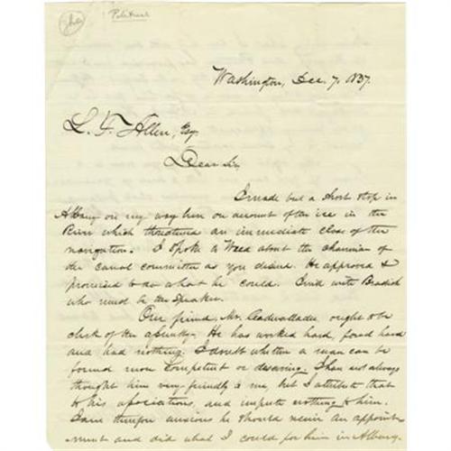 <B>Millard Fillmore Autograph Letter Signed </B></I>"<I>Millard Fillmore</B></I>"<I> as congressman.</B></I> One page, 8.25" x 10.25", Washington, December 7, 1837 to L.F. Allen urging an appointment for a Mr. Cadwallader. He writes, in part: "<I>Our friend, Mr. Cadawallader, ought to be clerk of the assembly. He has worked hard... and had nothing. I doubt whether a man can be found more competent or deserving...I have not always thought him very friendly to me, but I attribute that to his associations, and impute nothing to him...</B></I>" Light creases, else very fine condition. <I>Ex. Henry E. Luhrs Collection.</B></I><BR><BR><BR><b>Shipping:</b> Flat Material, Small (<a target="_blank" href="http://www.heritageauctions.com/common/shipping.php">view shipping information</a>)