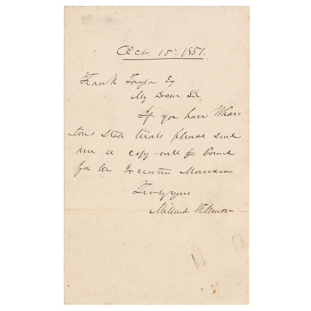 ALS as president, one page, 5 x 8, October 15, 1851. Handwritten letter to bookseller Frank Taylor, in part: "If you have Wharton's state trials please send me a copy…bound for the Executive Mansion." In very good to fine condition, with light soiling and some small tears. Taylor operated the Waverly Book-Store on Pennsylvania Avenue, providing works to Washington's elite movers and shakers for decades in the middle of the 19th century.