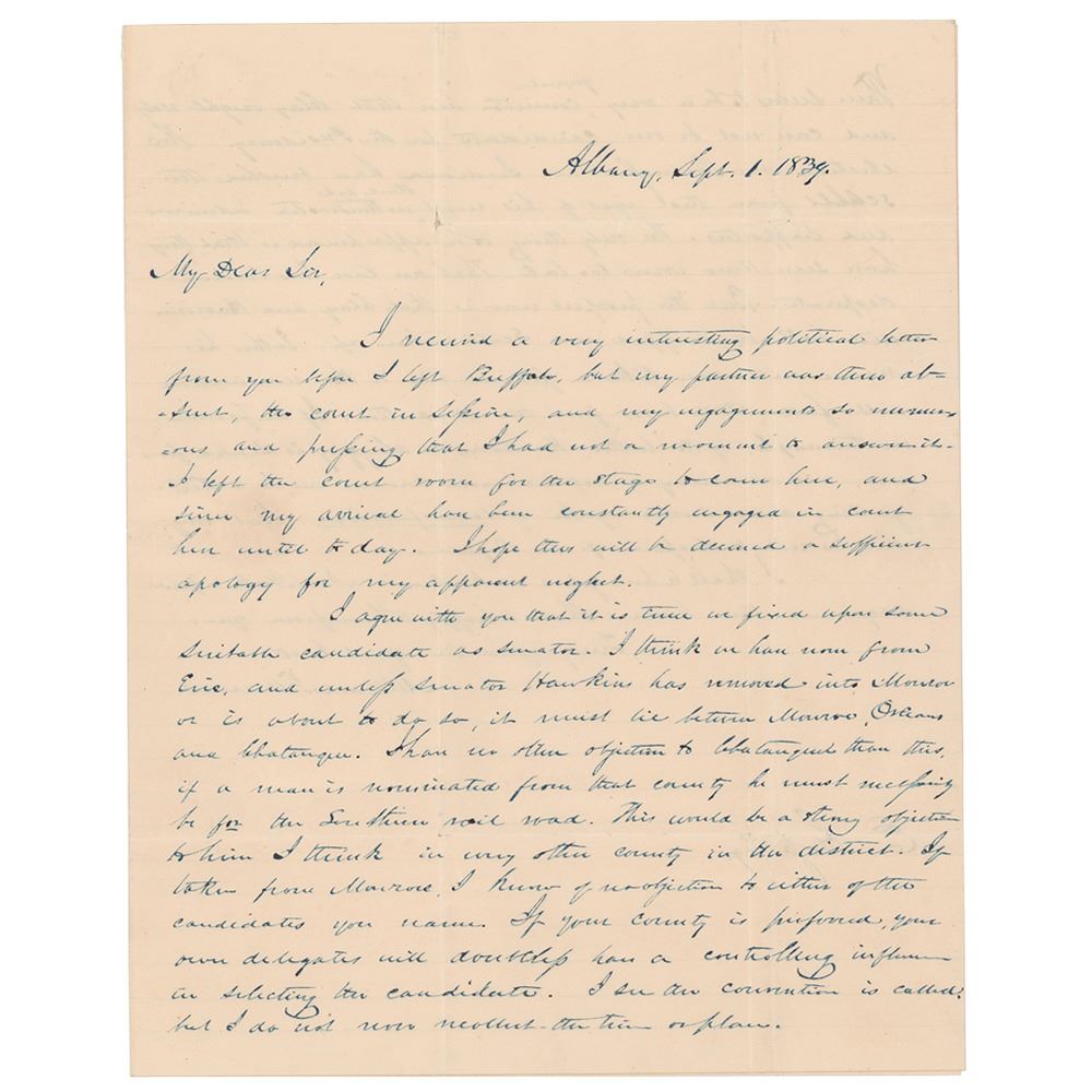 ALS, one page both sides, 8 x 10, September 1, 1839. Cordial handwritten letter to future New York State Senator Ephraim Gossin, which finds Fillmore considering several local political issues before candidly assessing Whig presidential hopefuls in the election of 1840. In full: “I received a very interesting political letter from you before I left Buffalo, but my partner was then absent, the court in session, and my engagements so numerous and pressing that I had not a moment to answer it. I left the courtroom for the stage to come here, and since my arrival have been constantly engaged in court here until today. I hope this will be deemed a sufficient apology for my apparent neglect.