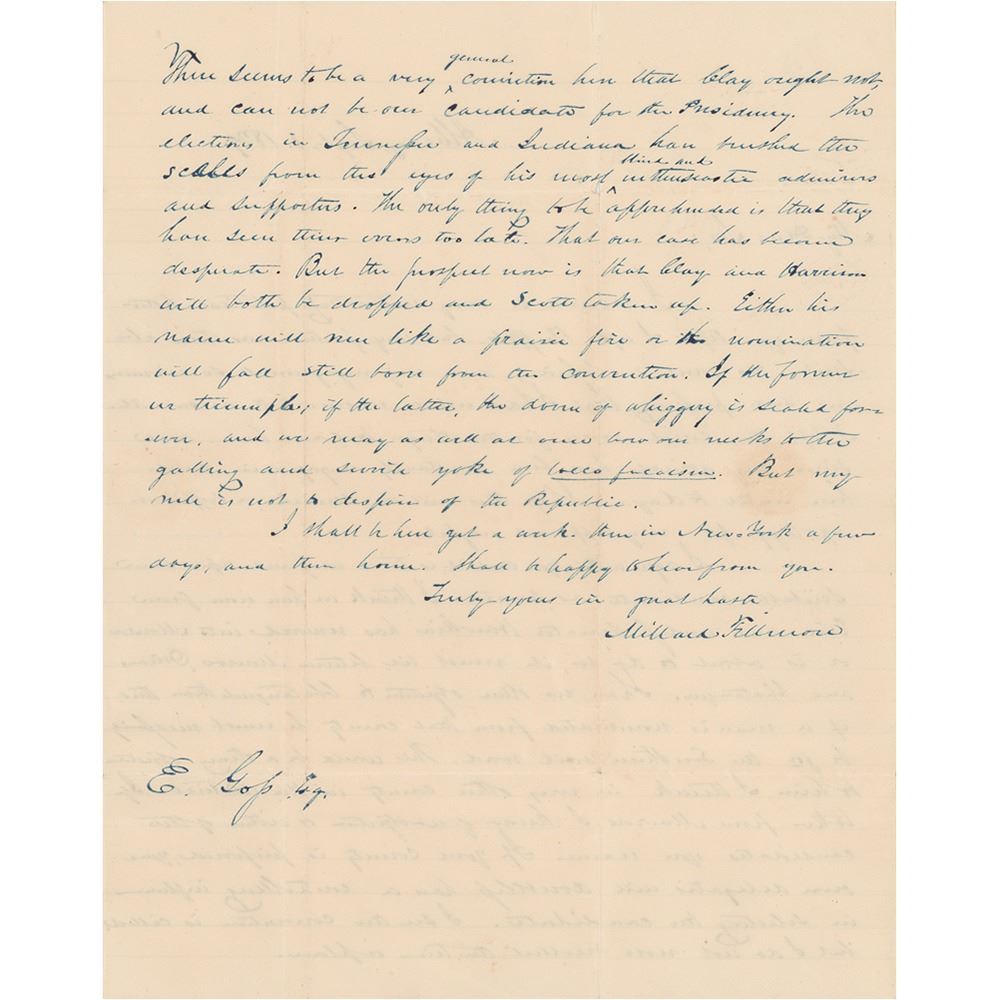 There seems to be a very general conviction here that Clay ought not, and can not be our candidate for the Presidency. The elections in Tennessee and Indiana have brushed the scales from the eyes of his most blind and enthusiastic advisors and supporters. The only thing to be apprehended is that they have seen their errors too late. That our case has become desperate. But the prospect now is that Clay and [William Henry] Harrison will both be dropped and [Winfield] Scott taken up. Either his name will run like a prairie fire or the nomination will fall still born from the convention. If the former we triumph, if the latter, the doom of whiggery is sealed forever, and we may as well at once bow our necks to the galling and servile yoke of locco focoism. But my note is not to despair of the Republic. I shall be here yet a week, then in New York a few days, and then home. Shall be happy to hear from you.†Addressed on the second integral page by Fillmore, who adds his franking signature in the upper right, "Free, M. Fillmore, M. C." In fine condition.
