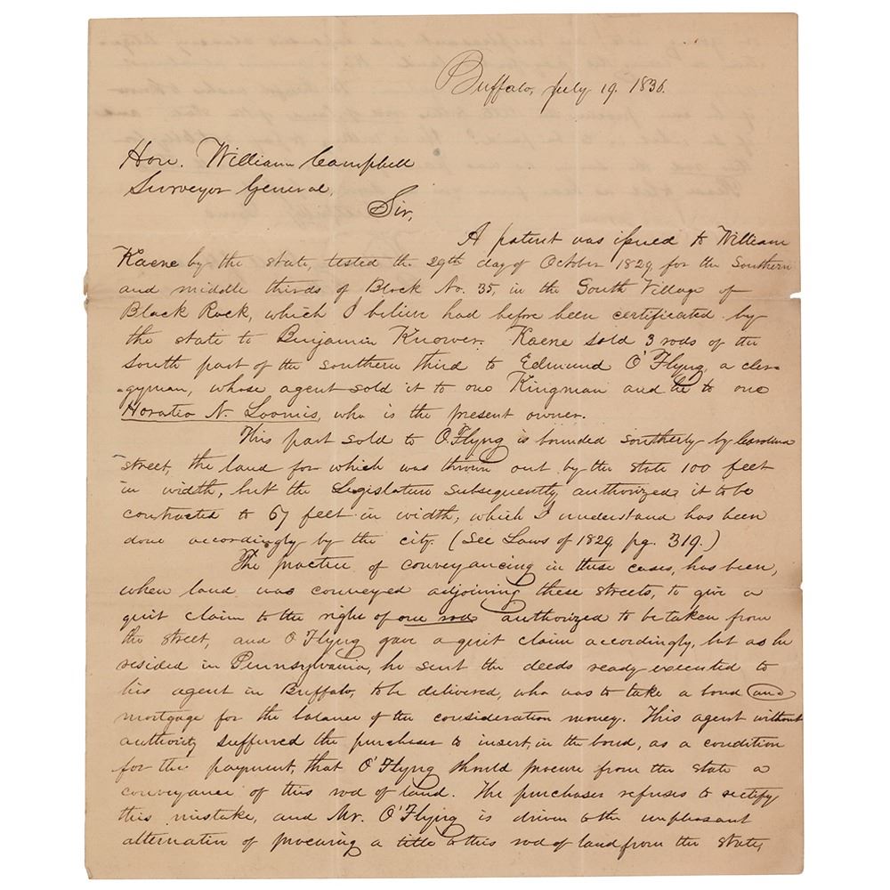 ALS signed “Fillmore, Hall & Haven, Per. Millard Fillmore,” one page both sides, 7.5 x 9, July 19, 1836. Addressed from Buffalo, New York, a handwritten letter from Fillmore to William Campbell, the Surveyor General, inquiring whether his client can obtain title to a small portion of land then owned by the state. In part: “The purchaser refuses to rectify this mistake, and Mr. O’Flying is driven to the unpleasant alternative of procuring a title to his rod of land from the state, or going into an unpleasant and expensive chancery litigation, or losing the pay for his land. He is anxious at almost any sacrifice to avoid litigation. He therefore wishes to know if he can procure the title to this rod of land of the state, and if so what is to be paid.” At the conclusion, Fillmore signs in his capacity as the partner handling the case. In fine condition.