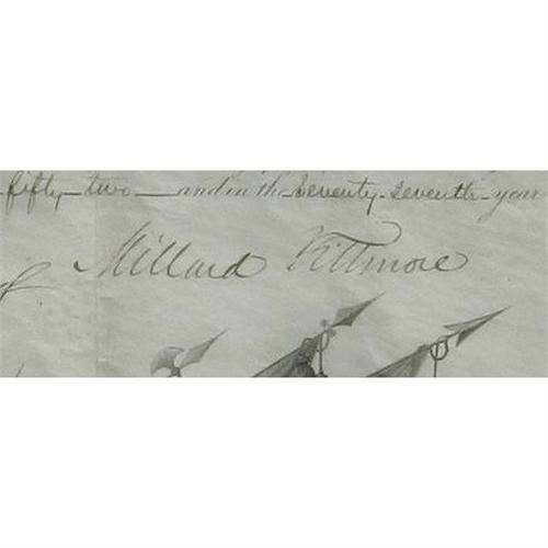 <B>Millard Fillmore Officer Commission Document Signed.</B></I> One page, 13.25" x 16.5", vellum, partly printed, Washington, September 2, 1852. An appointment of Stephen V. Benét as "...Second Lieutenant in the Ordnance Department..." effective July 10, 1851. Countersigned at the bottom by Charles Conrad as secretary of war and in the docketing by Samuel Cooper as Adjutant General. Cooper went on to be the highest-ranking general in the Confederate Army (the first of eight to be promoted to full general). Fillmore became president when Zachary Taylor died while in office. His attempts to reach a compromise on the slavery issue made him unpopular with both sides and he didn't even get the Whig Party's nomination to run for a full term in 1852. A later attempt to be elected president on the Know-Nothing Party ticket also failed. The document is in very good condition with a few very minor holes along the horizontal fold; the paper seal is intact. Matted and framed to an overall size of 19" x 22".