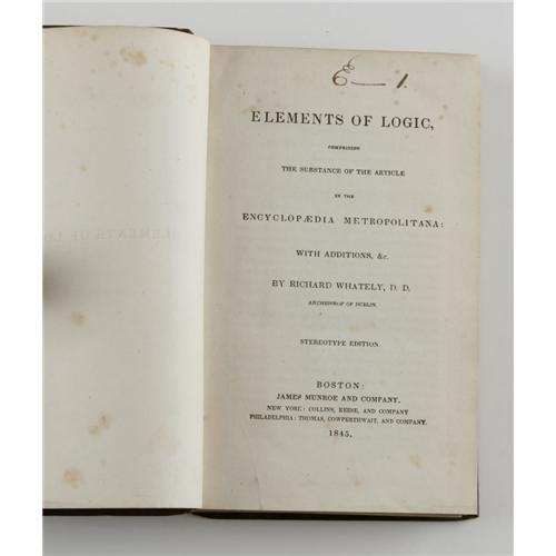 <B>Millard Fillmore Signed Book: <I>The Elements of Logic</B></I></B></I> by Richard Whatley. (Boston: James Munroe and Company, 1845), 359 pages, dark brown cloth, 12mo (4.75" x 7.75"), signed on the inside front cover "<I>Millard Fillmore March 6, 1846</B></I>". Fillmore was elected as a Whig to the 23rd Congress (1833-1835); elected to the 25th, 26th and 27th Congresses (1837-1843). (He declined to be a candidate for renomination in 1842.) He was an unsuccessful candidate for Governor of New York in 1844. He was State comptroller of New York until being elected vice president under Zachary Taylor. Front cover totally separated, pages lightly foxed.