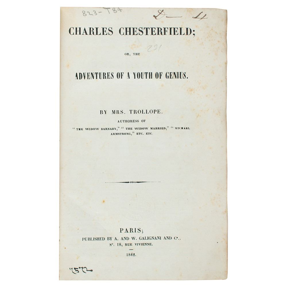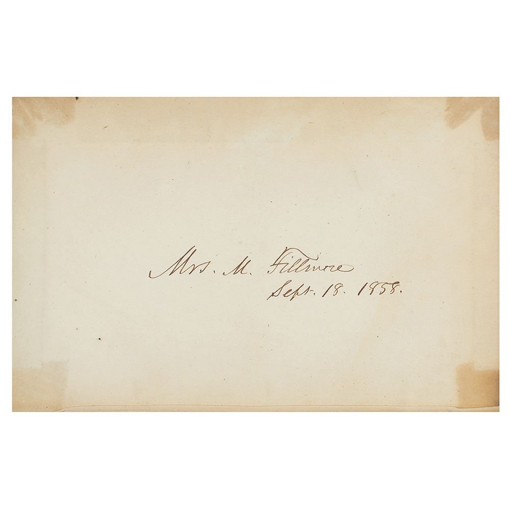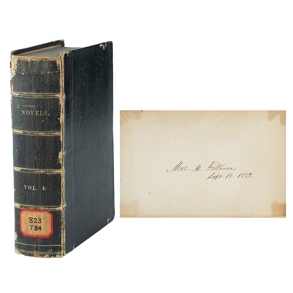 Signed book from the Fillmore family's personal library: Charles Chesterfield; or, the Adventures of a Youth of Genius by Mrs. Trollope. Paris: A. and W. Galignani and Co., 1842. Hardcover with dust jacket, 6 x 8.5. Signed on the front pastedown in ink by Fillmore on behalf of his wife, "Mrs. M. Fillmore, Sept. 18, 1858," and marked with the shelf location on the title page, "D-4." Autographic condition: fine, with toning to the corners of the signed page. Book condition: G+/None, with the front board detached, rear board almost detached, edgewear and rubbing to boards, and some foxing to textblock.