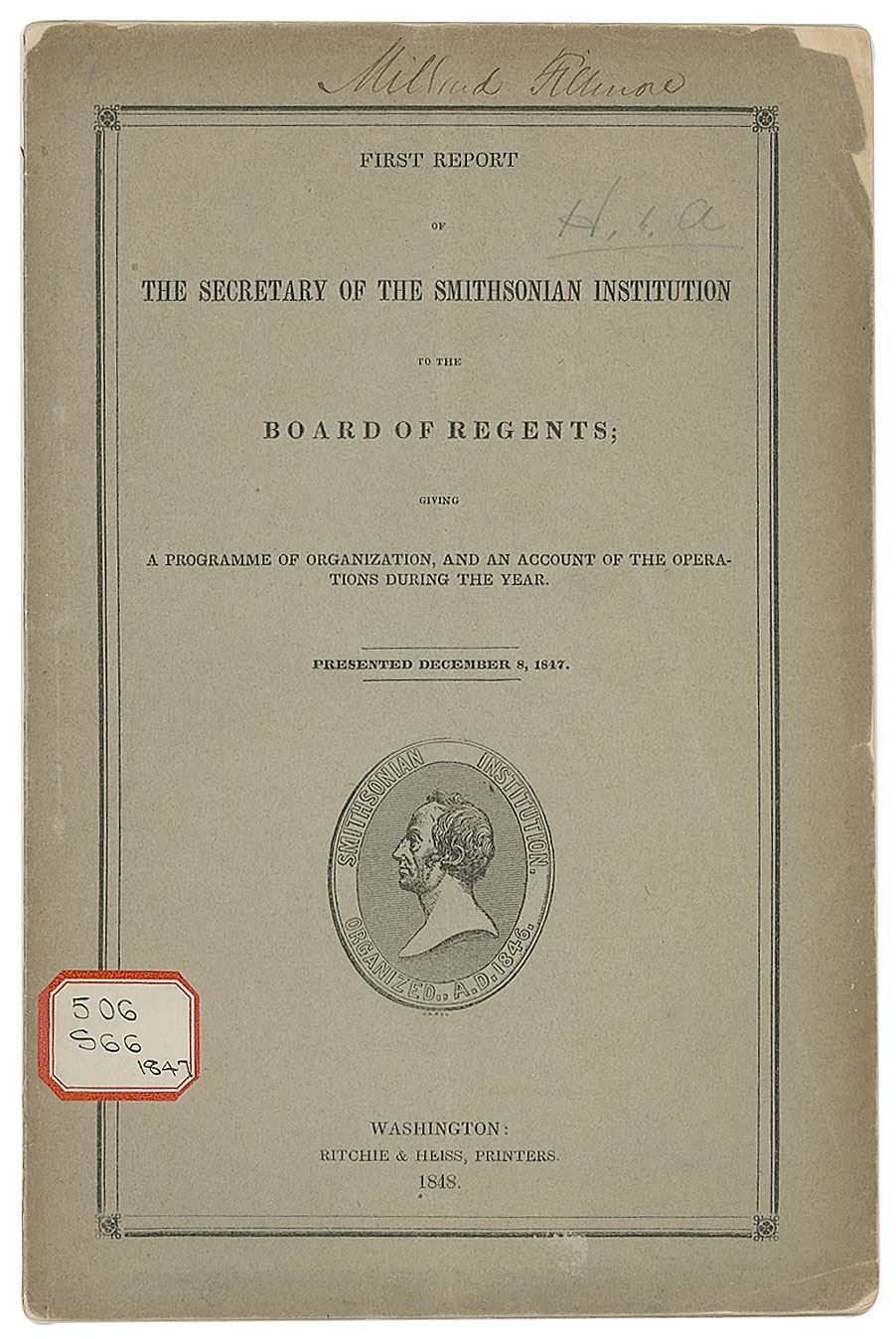 Official booklet entitled "First Report of the Secretary of the Smithsonian Institution to the Board of Regents: Giving a Programme of Organization, and an Account of the Operations During the Year," presented on December 8, 1847, published in 1848 by Ritchie & Heiss, 6 x 9.25, 48 pages, signed on the front cover in ink, "Millard Fillmore." Autographic condition: fine. Book condition: VG-/None, with a central vertical fold, edge toning, chipping and loss to the cover edges and spine, the creased rear wrapper detached but present, and a "Library of Lawrence E. Miller" blindstamp to the last page.