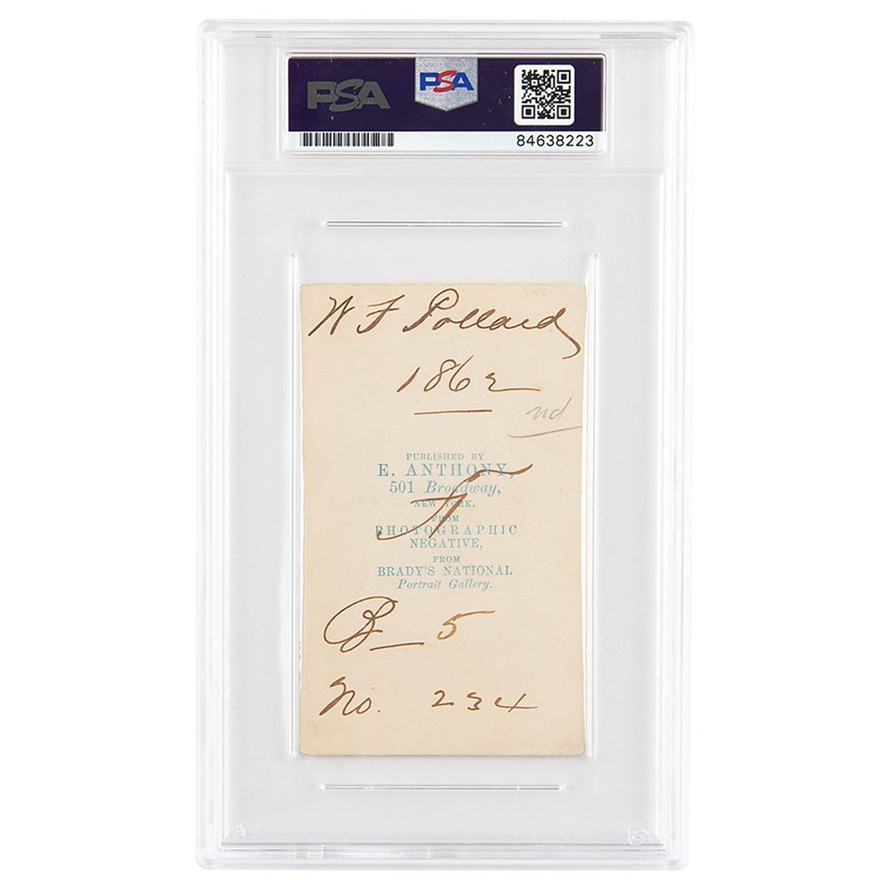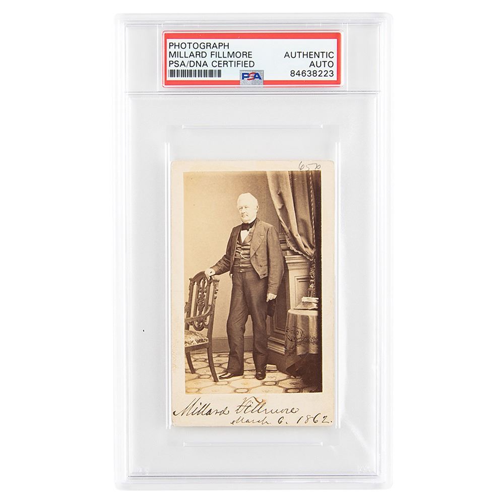 Rare 2.5 x 4 carte-de-visite photo of Fillmore in a full-length pose, published by E. Anthony from a negative from Mathew Brady's National Portrait Gallery, neatly signed on the mount in ink, "Millard Fillmore, March 6, 1862." Reverse is annotated in another hand. In fine to very fine condition. Extremely scarce in this format, this is just the fourth signed photo of Fillmore we have offered, and the only example of this handsome standing portrait that we have seen. Encapsulated in a PSA/DNA authentication holder.