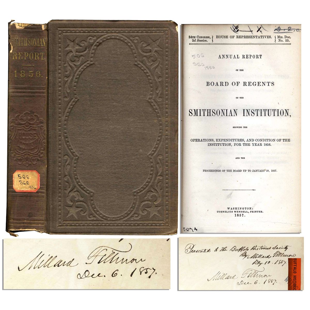 Millard Fillmore twice signed ''Annual Report of the Board of Regents of the Smithsonian Institution.'' Cornelius Wendell, Printer: Washington: 1857. The former President signs ''Millard Fillmore'' on the front pastedown on 6 December 1857 and again on 10 July 1867 in a presentation to the Buffalo Historical Society. As Vice President in 1849-50, he was on the Smithsonian Board of Regents and also served as its chancellor. Moderate chipping to 6'' x 9.25'' embossed brown boards, else very good. Signatures are precertified by PSA/DNA.