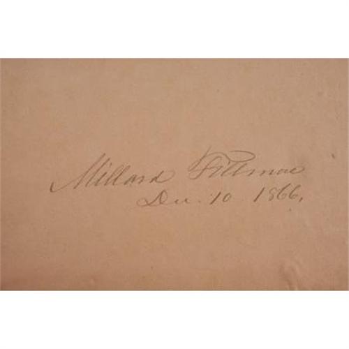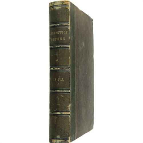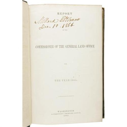 <B>Millard Fillmore Twice Signed </B></I><B><I>Report of the Commissioner of the General Land Office for the Year 1865</B></I></B></I>. (Washington: Government Printing Office, 1865), first edition, 168 pages, with 15 of 16 large fold out maps bound at back, signed “<I>Millard Fillmore Dec. 10, 1866</B></I>” on the front pastedown and signed identically on the title page, half leather binding with brown cloth boards, six compartments between five raised spine bands, gilt titles, 8vo (6” x 9.25”), bumped and rubbed corners, scuffing at the edges of the boards and spine, shelf wear, contents toned, missing one fold out map, else good condition.<BR><BR><b>Shipping:</b> Books & Catalogs (<a target="_blank" href="http://www.heritageauctions.com/common/shipping.php">view shipping information</a>)