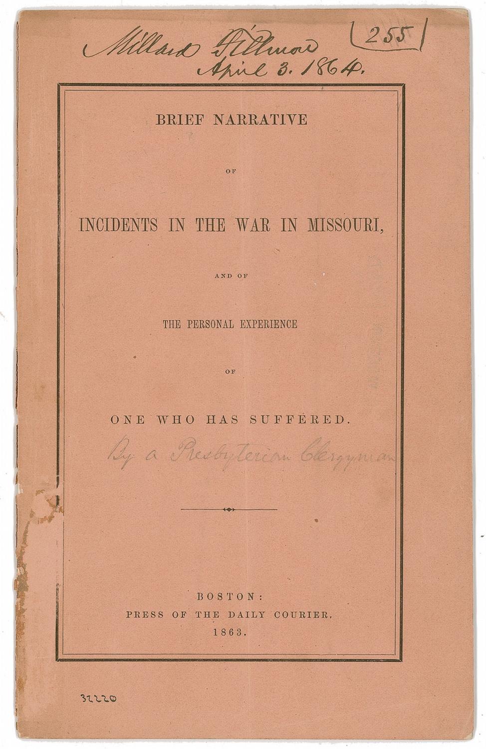 Pamphlet entitled “Brief Narrative of Incidents in the War in Missouri and of the Personal Experience of One Who Has Suffered,” 5.75 x 9.25, 28 pages, Boston: Press of the Dailey Courier, 1863. This 1863 pamphlet about Missouri in the Civil War, written by a pro-Union pastor who was arrested as a Southern sympathizer and banished to Massachusetts, bears an ownership signature across the top in black ink, “Millard Fillmore, April 3, 1864,” adding the shelf location number “255,” to the top right. Also written in pencil beneath the title, seemingly in Fillmore’s hand, “By a Presbyterian Clergyman.” In very good condition, with bisecting vertical fold, light creasing and soiling to cover, and a “Buffalo & Erie County Historical Society Library” stamp to inside front cover. Fillmore was one of the founders of the Society and served as its first President from 1862-1867. It was during this period that Fillmore added this Civil War pamphlet to his personal library. A boldly signed example from the obviously meticulous former president.