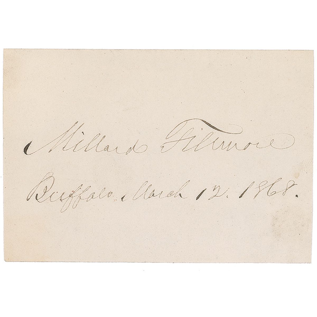 Ink signature, “Millard Fillmore, Buffalo, March 12, 1868,” on an off-white 4 x 2.75 clipped slip. In very good condition, with light toning, soiling, and the signature a bit light. Accompanied by a signature of his vice president, George Dallas, on a slip with two additional signatures.
