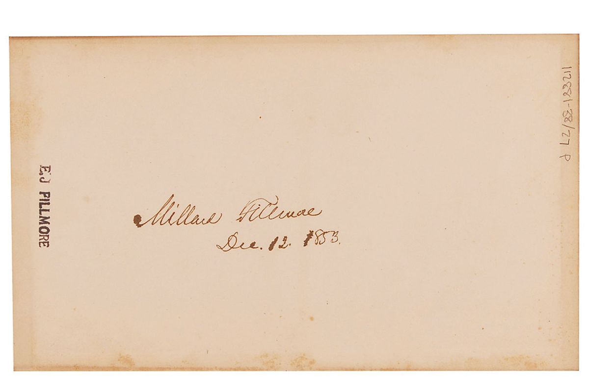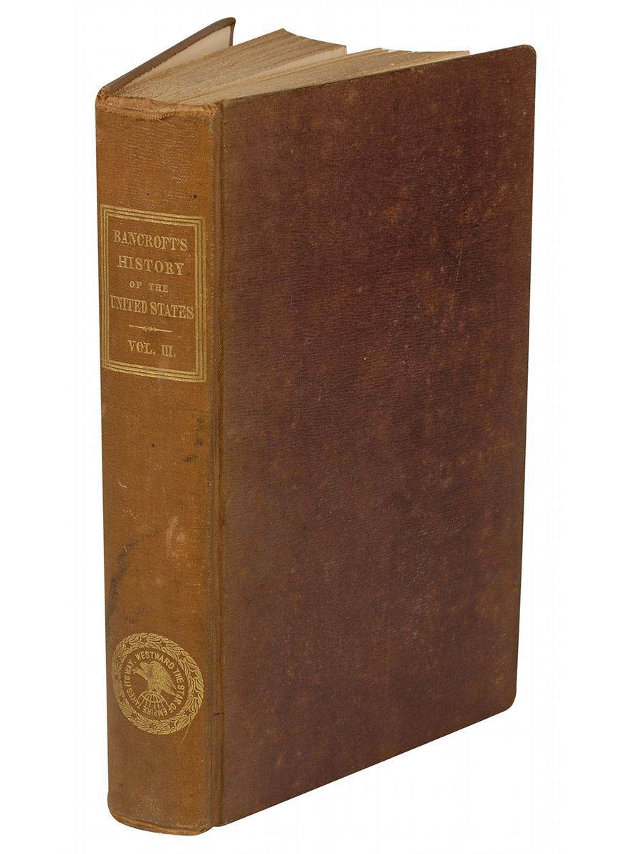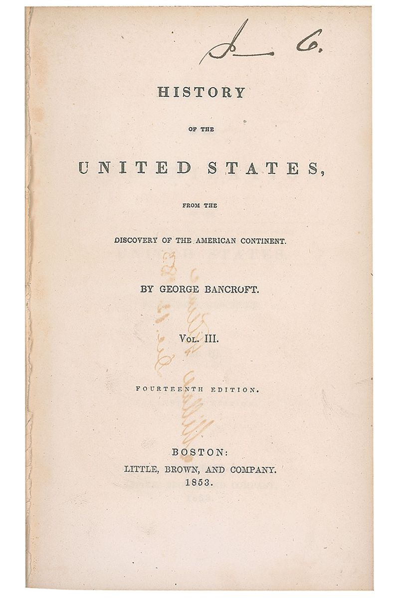 Signed book: History of the United States, from the Discovery of the American Continent by George Bancroft. Volume III. Later printing. Boston: Little, Brown and Company, 1853. Hardcover, 6 x 9.5, 477 pages. Front pastedown bears a vertical ownership signature, “Millard Fillmore, Dec. 12, 1853.” On the title page Fillmore has penned the book’s location on his library shelf: “I – C.” Book also has several marginal pencil notations: “Mary queen of scots, Charles the 1st Charles the 2d” (p1), “Somers” (p11), “Cousin James 2d Earl of Clarendon” (p61), “Achan, who concealed some of the Spoils of Jericho and was stoned to death with his family – 7 Joshua-” (p84), “S.E. end of Georgian Bay, lake Huron” (p131), “Soult de St. Mary” (p149), and “changed west” (p382). Autographic condition: some light spreading to ink of a few strokes of signature, an EJ Fillmore stamp to front pastedown, scattered light toning and foxing, and a pencil notation to top, otherwise fine. Book condition: VG-/None. Brown cloth-covered boards with gilt lettering to spine; spine sunned; edges worn, with cloth fraying at corners and spine-ends; exterior foxed; textblock edges darkened; some light offsetting from text throughout.