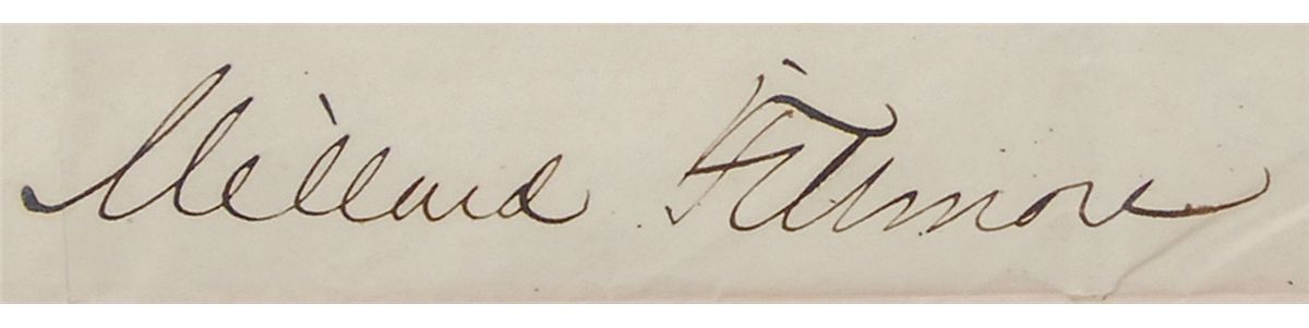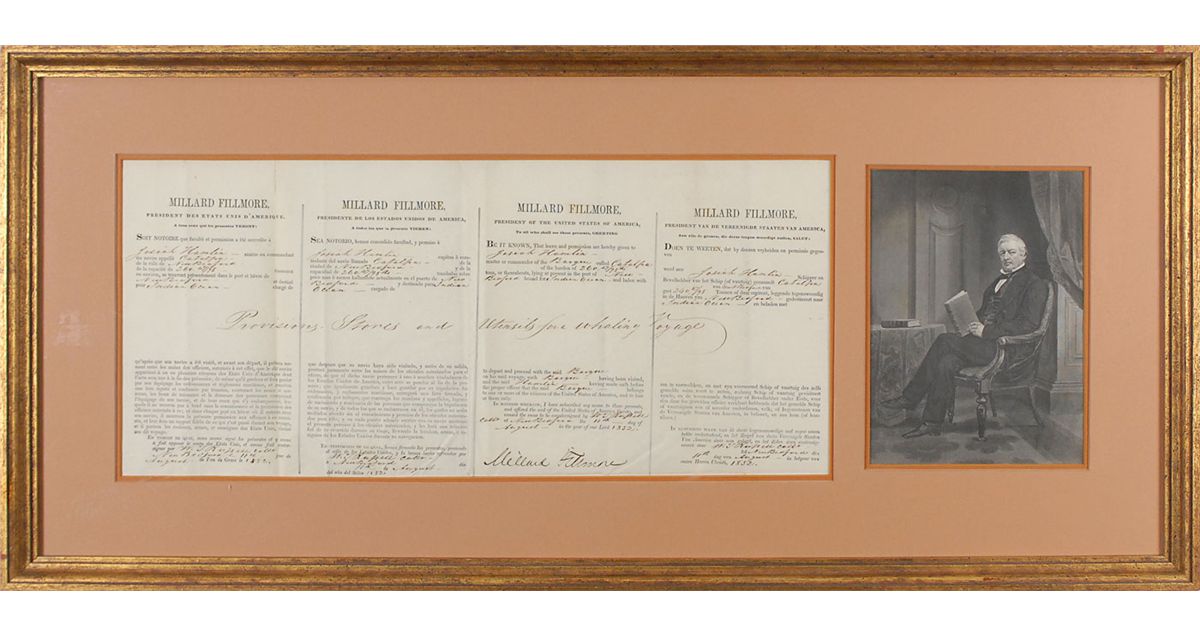 Partial self-contained partly-printed DS as president, one page, 18 x 8, August 11, 1852. Upper portion of four-language ship’s papers issued to “Josiah Hamlin master or commander of the Barque called Catalpa…lying at present in the port of New Bedford bound for Indian Ocean and laden with Provisions Utensils and Stores for a whaling voyage.” Signed at the bottom of the third panel by Fillmore. Double-matted and framed with a portrait of Fillmore to an overall size of 30.25 x 13.75. In fine condition, with expected vertical folds and a few creases, a couple touching the end of signature. Sailing from August of 1852 until August of 1856, the Catalpa brought back 806 barrels of sperm whale oil and 21 barrels of baleen whale oil. Oversized.