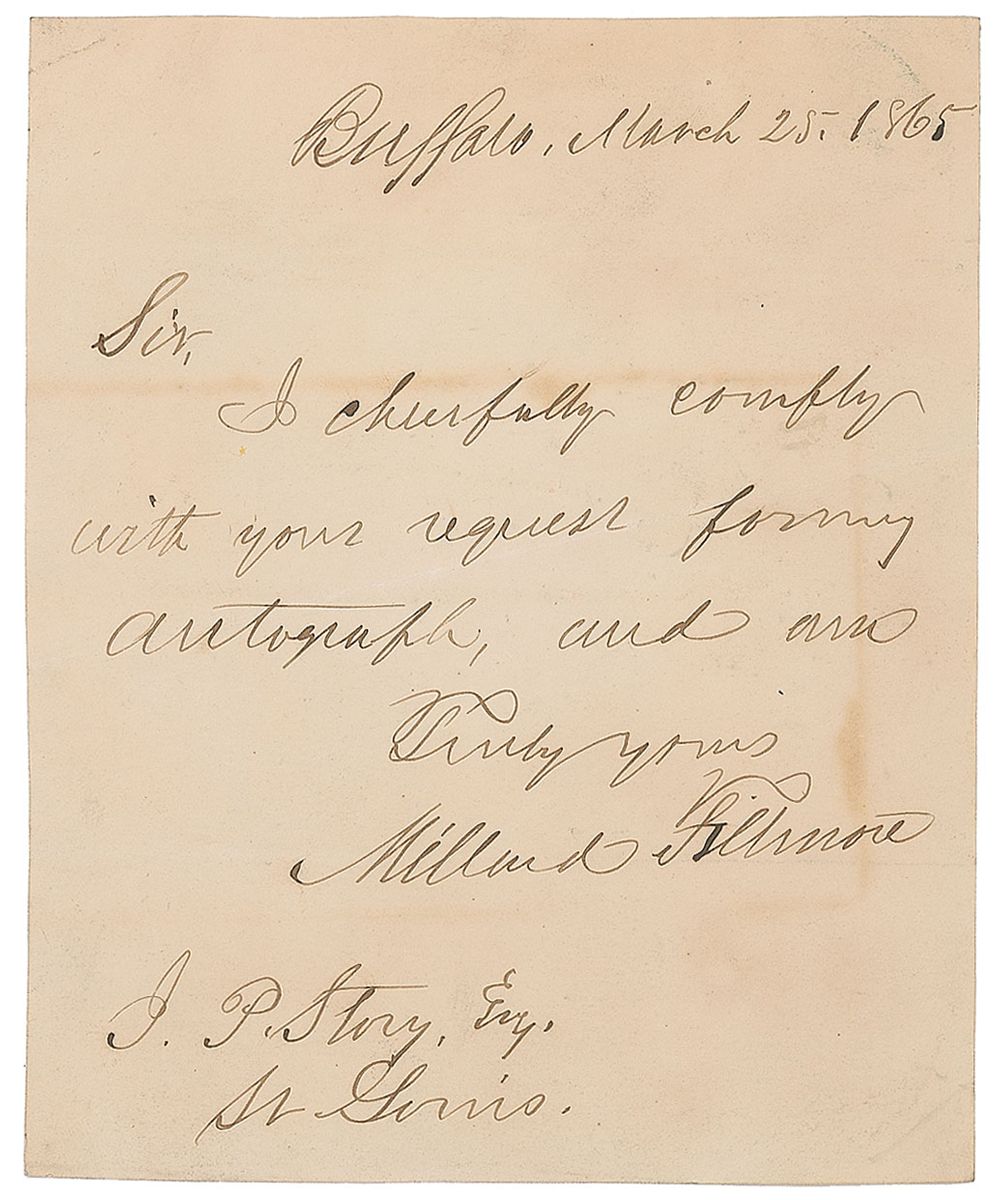 War-dated ALS, one page, 4 x 5, March 25, 1865. Brief letter to J. P. Story of St. Louis. In full: “I cheerfully comply with your request for my autograph.” In very good condition, with a few creases and various bands of toning.