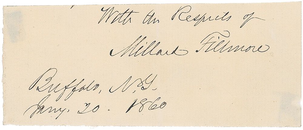 Ink signature, “With the Respects of Millard Fillmore, Buffalo, N. Y., Jany. 20, 1860,” on an off-white 5 x 2 slip clipped from the closing of a letter. In fine condition, with a central vertical fold passing through a single letter of signature and small mounting remnants on reverse.