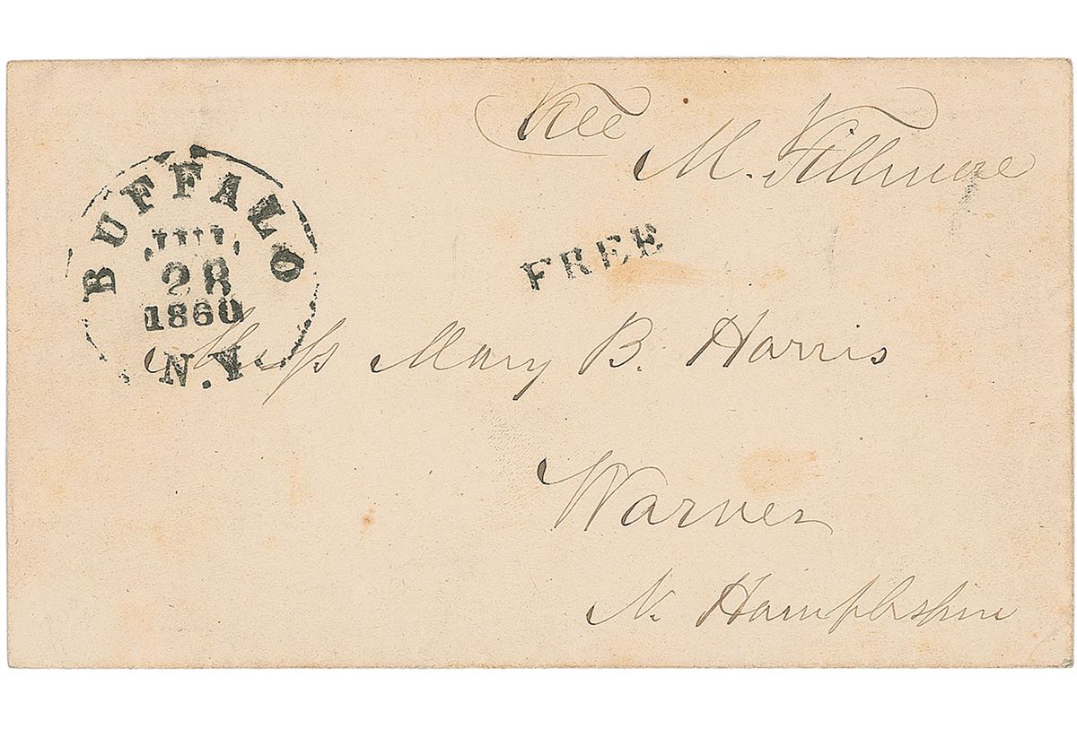 Hand-addressed free-franked mailing envelope, 5.5 x 3, addressed by Fillmore to “Miss Mary B. Harris, Warner, N. Hampshire,” and franked at the top, “Free, M. Fillmore.” Envelope bears a July 28, 1860, Buffalo, New York postal cancellation. In fine condition, with a bit of scattered light toning and soiling.