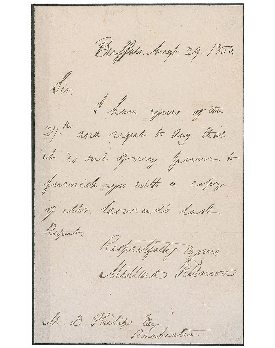 ALS, one page, 4 x 6.5, August 29, 1853. Letter to M. D. Philips. In full: “I have yours of the 27th and regret to say that it is out of my power to furnish you with a copy of Mr. Conrad’s last Report.” In fine condition, with mounting remnant to reverse of one vertical edge and a bit of light wrinkling.