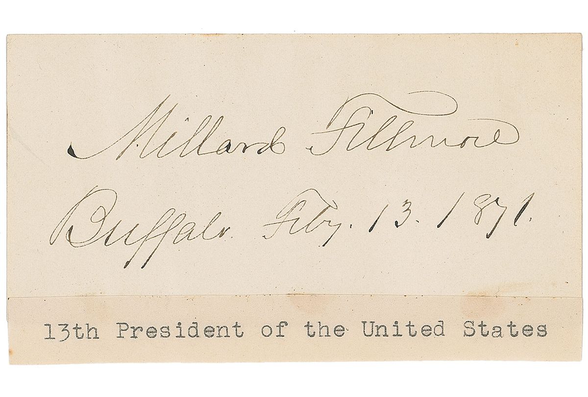 Ink signature, “Millard Fillmore, Buffalo, Feby. 13, 1871,” on an off-white 4 x 2.25 card, with a typed collector’s caption affixed to bottom edge. In fine condition.