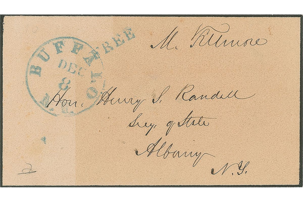 Hand-addressed and free-franked mailing envelope circa 1852–1853, 4.75 x 2.75, addressed in Fillmore’s hand to “Hon. Henry S. Randall, Secy of State, Albny, N. Y.,” and franked in the upper right, “M. Fillmore.” The envelope bears a December 8, Buffalo, “Free” postal cancellation stamp on the left side. A mild block of toning, otherwise fine condition. Randall served as New York’s secretary of state from 1852 to 1853, and in 1858 published what is considered the most complete and authoritative biography ever written on Thomas Jefferson.