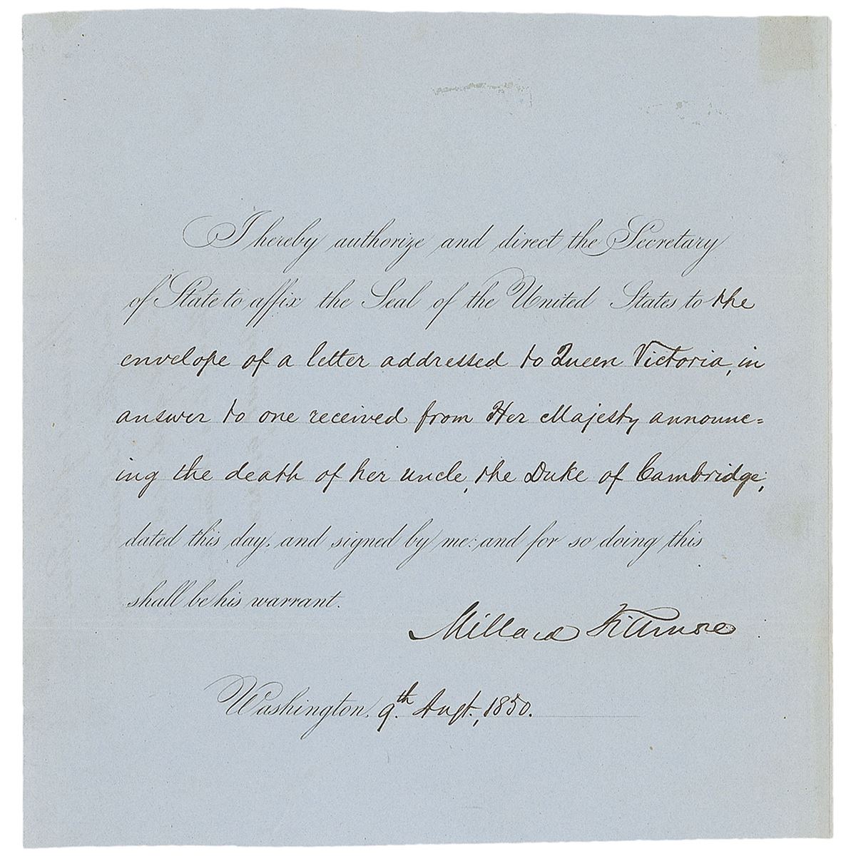 Partly-printed DS as president, one page, 8 x 8.25, August 9, 1850. President Fillmore authorizes and directs the secretary of state to “affix the Seal of the United states to the envelope of a letter addressed to Queen Victoria, in answer to one received from Her Majesty announcing the death of her uncle the Duke of Cambridge.” In fine condition, with a light horizontal fold passing through the signature, light areas of toning to the upper portion, and trimmed top and bottom edges.
