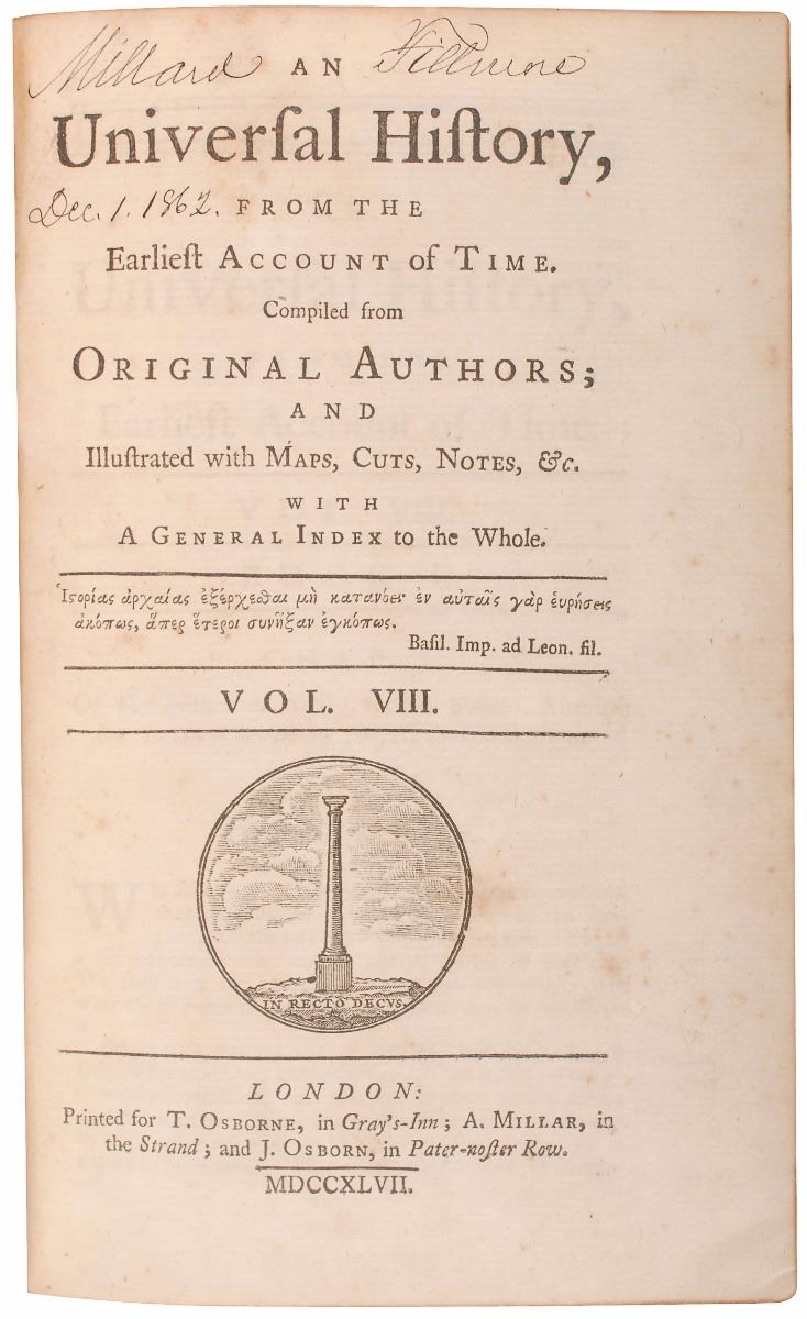 Signed book: Universal History, Vol. VIII. London: Printed for T. Osborne, 1747. Rebound in a hardcover library binding, 5.25 x 8.5, 658 pages. Signed on the title page in black ink, “Millard Fillmore, Dec. 1, 1862.” Light foxing and soiling, otherwise fine condition.