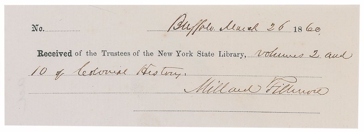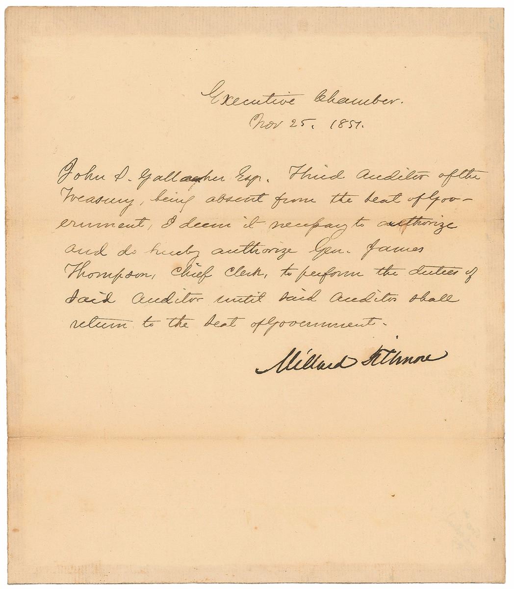 Two DSs: a manuscript DS as president, one page, 8 x 9, November 25, 1851, in part: “John D, Gallagher Esq. Third Auditor of the treasury, being absent…I deem it necessary to authorize…Gen. James Thompson, Chief Clerk, to perform the duties of said auditor”; and a partly-printed DS, one page, 6.5 x 2.25, March 26, 1860, a New York State Library slip for “Volumes 2 and 10 of Colonial History.” In overall fine condition, with overall toning to the document.