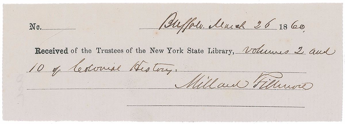 Partly-printed DS, one page, 6.5 x 2.25, March 26, 1860. An interesting library slip, in full: “Received of the Trustees of the New York State Library, Volumes 2 and 10 of Colonial History.” In fine condition. An unusual format with a fine historical association.