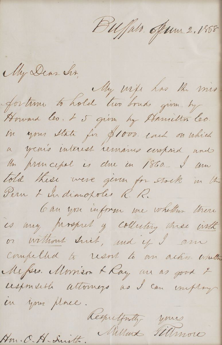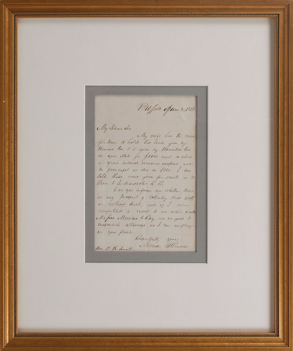 ALS, one page, 4.75 x 7.5, June 2, 1858. Letter to Indiana congressman O. H. Smith, in part: “My wife has the misfortune to hold two bonds given by Howard Co. & 5 given by Hamilton Co. in your state for $1000 each on which a year’s interest remains unpaid and the principal is due in 1860. I am told these were given for stock in the Peru & Indianapolis R. R. Can you inform me whether there is any prospect of collecting these with or without suit, and if I am compelled to resort to an action whether…Morrison & Ray are as good & responsible attorneys as I can employ in your place.” Framed and in fine condition.