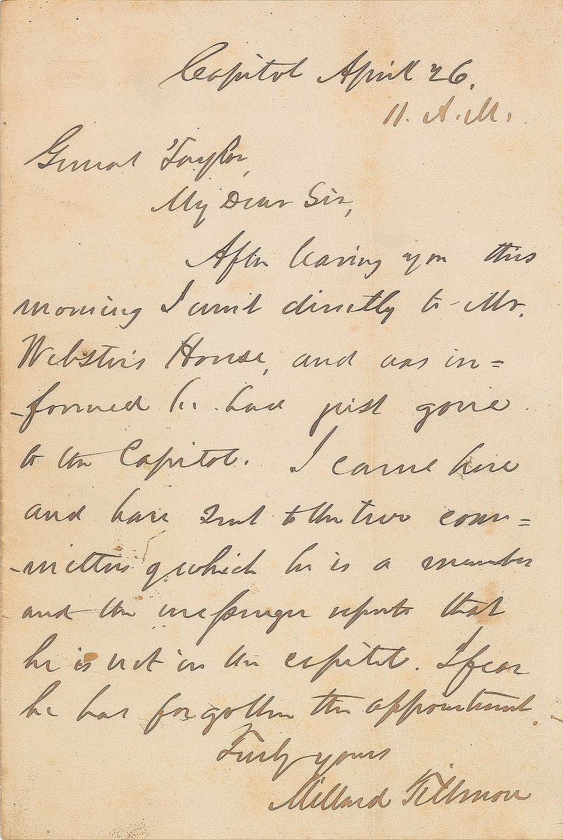 ALS as vice president, one page, 4.75 x 7.25, April 26. Letter to President Zachary Taylor, in full: “After leaving you this morning I went directly to Mr. Webster’s House, and was informed he had just gone to the Capitol. I came here and have sent to the two committees of which he is a member and the messenger reports that he is not in the capitol. I fear he has forgotten the appointment.” In fine condition, with mounting remnants to reverse of second integral page. In the wake of his Seventh of March speech, Massachusetts Senator Daniel Webster became a vilified political figure amongst New England abolitionists for his support of the Compromise of 1850 and the Fugitive Slave Law, positions he would maintain throughout his tenure as secretary of state. Although this letter likely points to little more than a missed appointment, Fillmore’s concern no doubt reflects the growing consternation around the suddenly unpopular Webster. Written just three months before the unexpected death of President Taylor, this is an interesting letter with great historical associations.