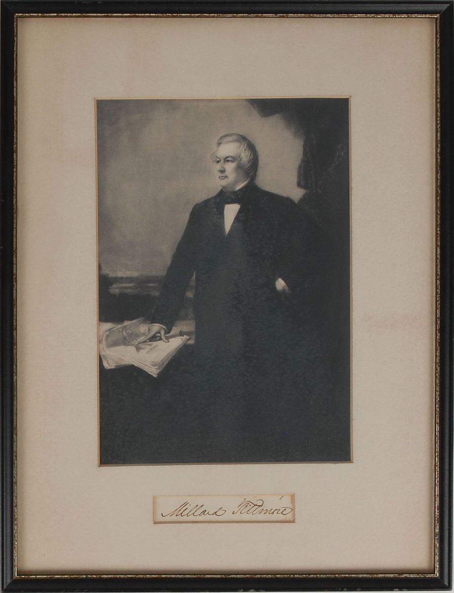 Bold ink signature, “Millard Fillmore,” on an off-white slip, matted and framed with a portrait to an overall size of 12.5 x 16. In fine condition.