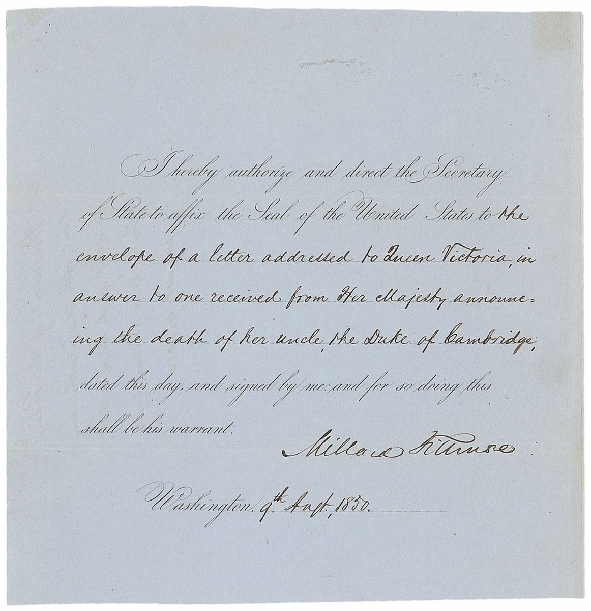 Partly-printed DS as president, one page, 8 x 8.25, August 9, 1850. President Fillmore authorizes and directs the secretary of state to "affix the Seal of the United states to the envelope of a letter addressed to Queen Victoria, in answer to one received from Her Majesty announcing the death of her uncle the Duke of Cambridge." In fine condition, with a light horizontal fold passing through the signature, light areas of toning to the upper portion, and trimmed top and bottom edges. Pre-certified PSA/DNA.