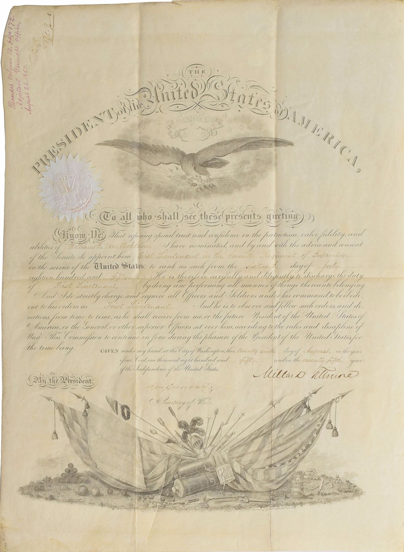 Partly-printed vellum DS as president, one page, 14.5 x 19.5, August 26, 1850. President Fillmore appoints William K. Van Bokkelen as "First Lieutenant in the Seventh Regiment of Infantry in the service of the United States." Signed at the conclusion by Fillmore, and countersigned by Secretary of War Charles M. Conrad. White paper seal remains affixed to upper left portion. In fine condition, with scattered light soiling.