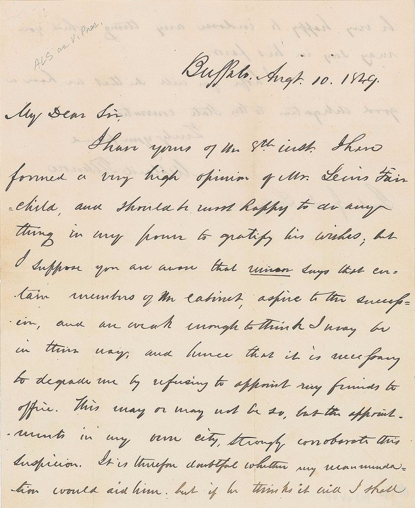 ALS as vice president, one page both sides, 7.25 x 8.75, August 10, 1849. Letter to General J. D. Ledyard, in part: “I have yours of the 8th. inst. I have formed a very high opinion of Mr. Lewis Fairchild, and should be most happy to do anything in my power to gratify his wishes; but I suppose you are aware that…certain members of the cabinet, aspire to the succession, and are weak enough to think I may be in their way, and hence that it is necessary to degrade me by my refusing to appoint my friends to office. This may or may not be so, but the appointments in my own city, strongly corroborate this suspicion. It is therefore doubtful whether my recommendation would aid him, but if he thinks it will, I shall be very happy to endorse anything which you may say in his favor.” In fine condition.