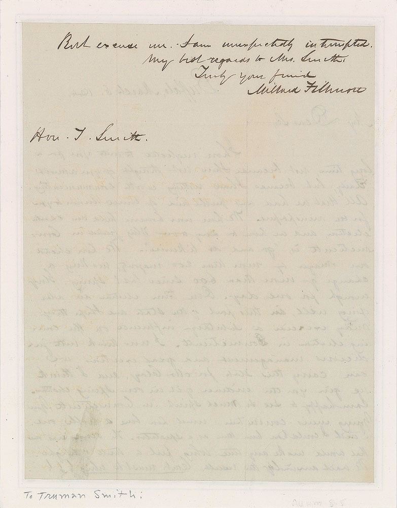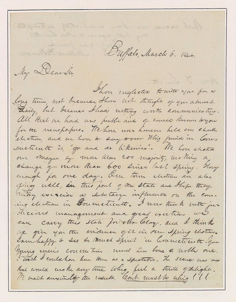 ALS, one page, 7.5 x 10, March 6, 1844. Letter to Congressman Truman Smith of Connecticut. In part: "We have to say to our Whig friends in Connecticut is, 'go and do likewise.' We have elected our Mayor by more than 200 majority, making a change of more than 600 since last spring. Glory enough for one day. Our town elections are going well in this part of the state and I hope they may exercise a sanitary influence on the coming elections in Connecticut. I now think with judicious management and great exertions we can carry this state for Mr. Clay, and I think we give you the evidence of it in our Spring elections…Your young men's convention must have been a noble one…The scene was one that would make any true Whig feel a thrill of delight. We wait anxiously for the result. Connt. must be Whig!!!" Professionally inlaid into a slightly larger sheet. In fine condition. Excellent electoral content in this important political correspondence; Congressman Smith would later serve as chairman of the Whig National Committee that nominated the Taylor-Fillmore ticket. Fillmore references the upcoming 1844 presidential election, which was contested between the Whig Henry Clay and the Democrat James K. Polk. Contrary to Fillmore's hopes, Clay lost New York by just one percent; he did, however, win Connecticut.