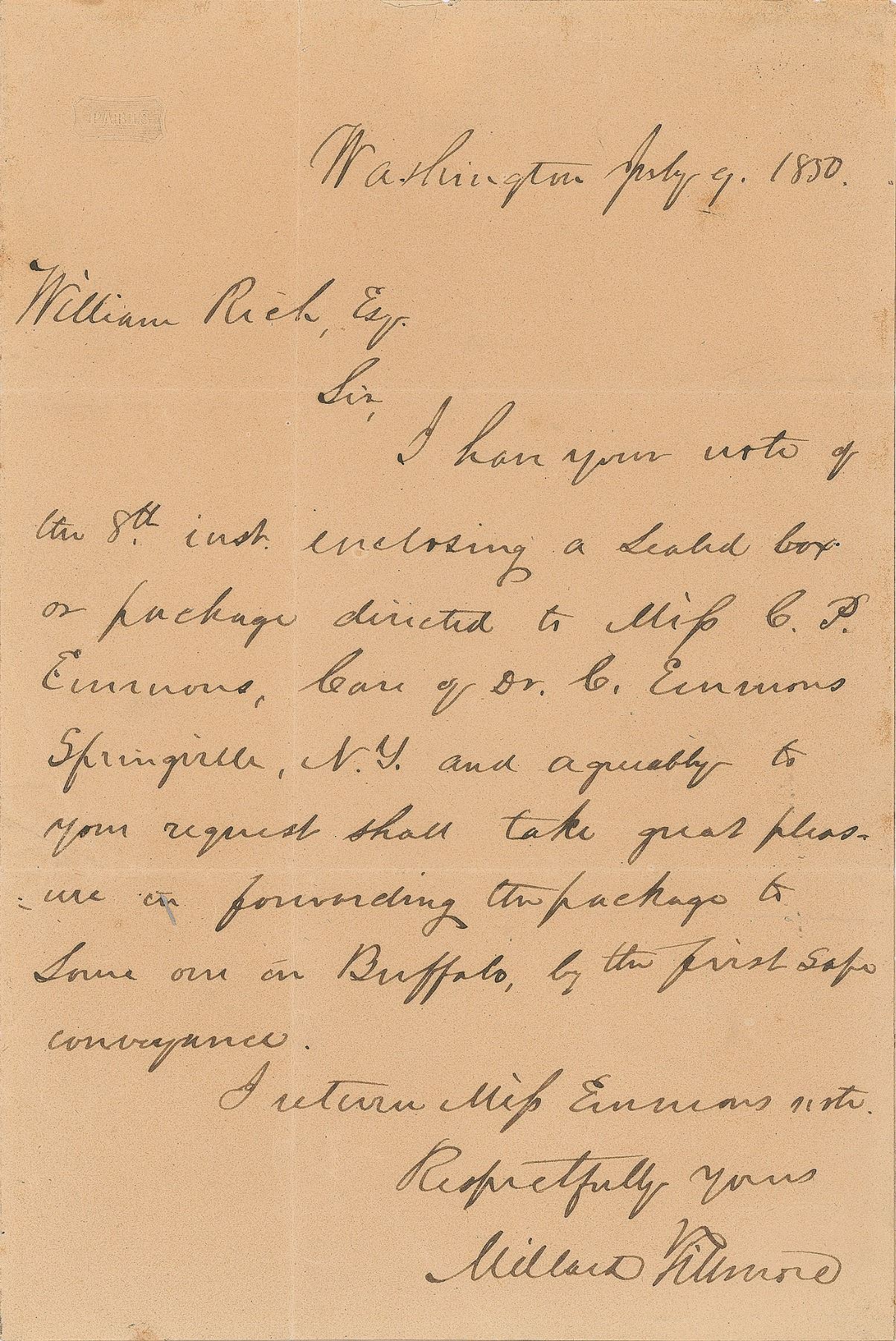ALS as vice president, one page, 5 x 7.25, July 9, 1850. Letter to William Rich, in full: "I have your note of the 8th inst. enclosing a sealed box or package directed to Miss C. P. Emmons, Care of Dr. C. Emmons, Springville, N.Y. and agreeably to your regards shall take great pleasure in forwarding the package to some one in Buffalo, by the first safe conveyance." In fine condition.