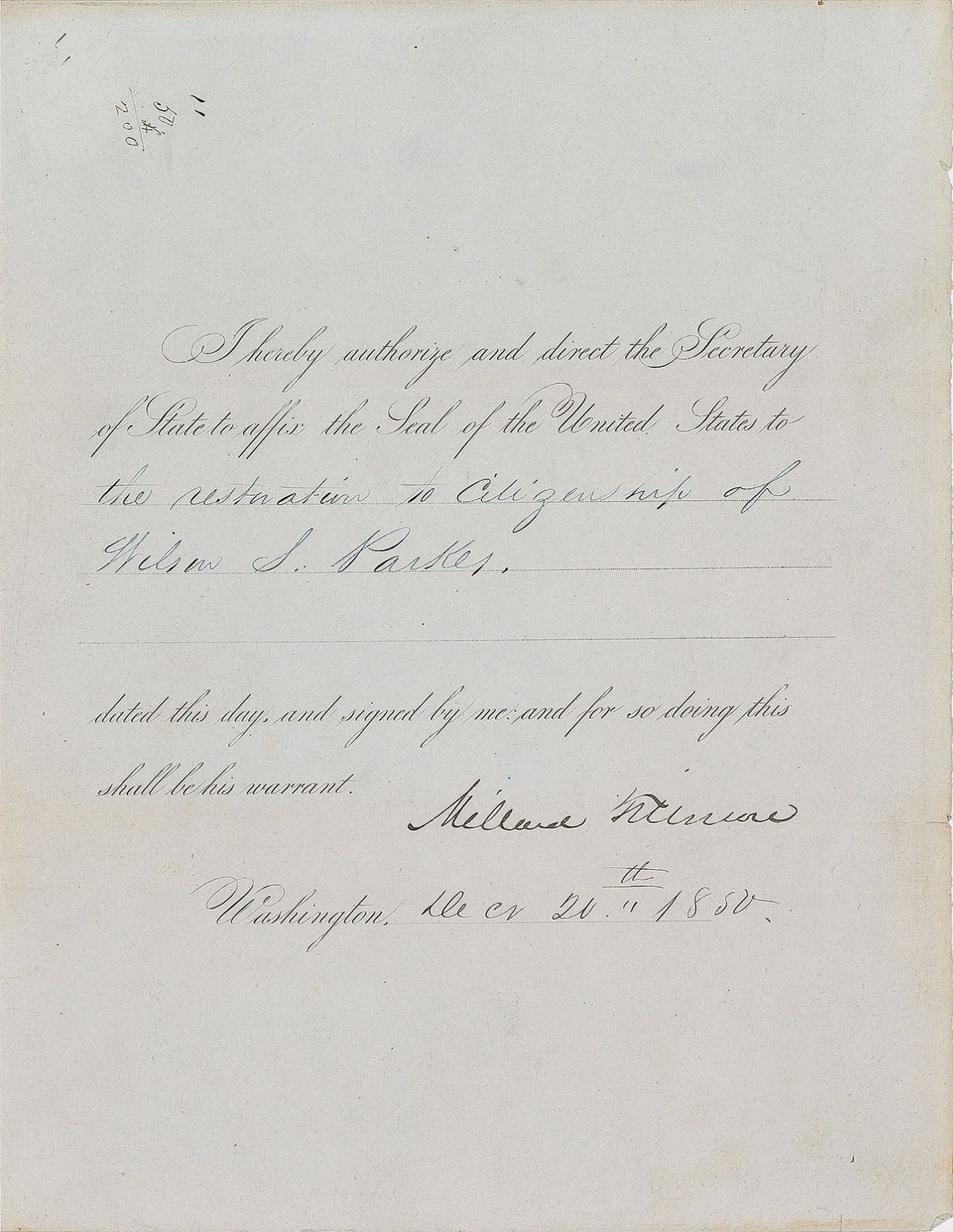 Partly-printed DS as president, one page, 8 x 10.25, December 20, 1850. President Fillmore authorizes and directs the secretary of state to “affix the Seal of the United states to "the restoration to citizen life of Wilson S. Parkes." Crisply signed at the conclusion by Fillmore. In fine condition.
