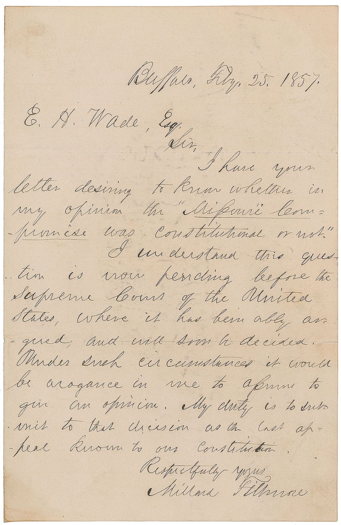 ALS, one page, 5 x 7.75, February 25, 1857. Letter to E. H. Wade, in full: “I have your letter desiring to know whether in my opinion the ‘Missouri Compromise was constitutional or not.’ I understand this question is now pending before the Supreme Court of the United States, where it has been ably argued, and will soon be decided. Under such circumstances it would be arogance [sic] in me to assume to give an opinion. My duty is to submit to that decision as the last appeal known to our constitution.” In fine condition, with faint toning at the corners.