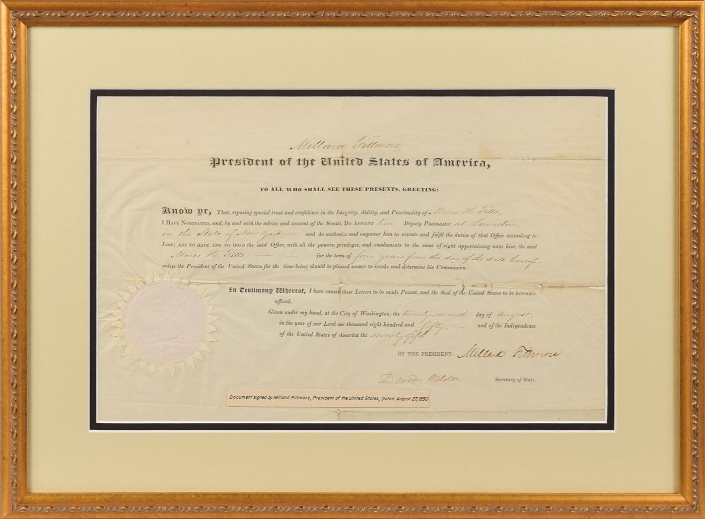Partly-printed DS as president, one page, 14.5 x 9.25, August 27, 1850. President Fillmore appoints Moses H. Fitts as "Deputy Postmaster at Lewiston, in the State of New York." Signed at the conclusion by Fillmore, and countersigned by Secretary of State Daniel Webster. White paper seal remains affixed to lower left. Nicely double-matted and framed to an overall size of 20.25 x 15. In very good to fine condition, with splitting to, and small areas of paper loss along, the intersecting folds.