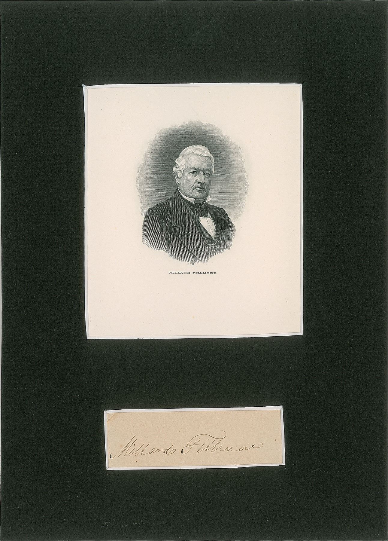 Ink signature, "Millard Fillmore," on an off-white 3.5 x 1 slip. Matted with an engraved portrait to an overall size of 8 x 11. In fine condition.