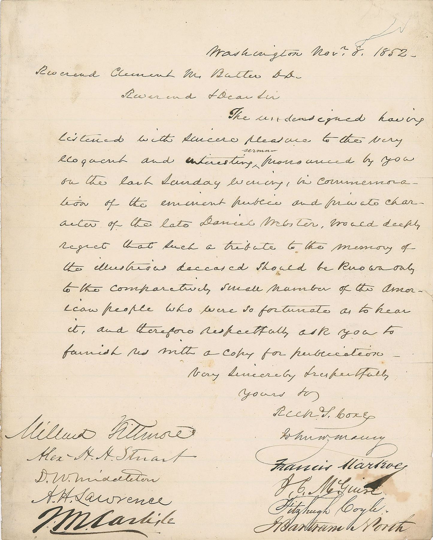 LS as president, one page, 7.75 x 9.75, November 8, 1852. Letter to Reverend Clement M. Butler, in full: "The undersigned having listened with sincere pleasure to the very eloquent and interesting sermon pronounced by you on the last Sunday evening, in commemoration of the eminent public and private character of the late Daniel Webster, would deeply regret that such a tribute to the memory of the illustrious deceased should be known only to the comparatively small number of the American people who were so fortunate as to hear it, and therefore respectfully ask you to furnish us with a copy for publication." Signed at the conclusion by Fillmore, and countersigned by several members of Congress, including Alexander Hugh Holmes Stuart, D. W. Middleton, A. H. Lawrence, I. M. Carlisle, Richard Coxe, John W. Maury, Francis Marker, J. C. McGuire, Fitzhugh Coyle, and J. B. North. In fine condition, with light stains, and short splits along folds.