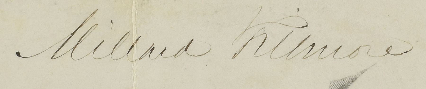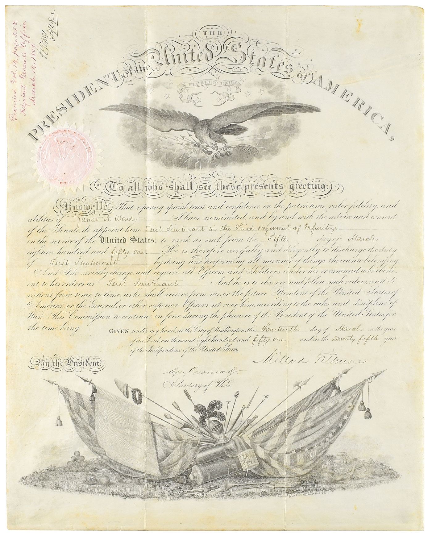 Partly-printed vellum DS as president, one page, 13.75 x 17.5, March 14, 1851. President Fillmore appoints James N. Ward as "First Lieutenant in the Third Regiment of Infantry, in the service of the United States." Signed at the conclusion by President Fillmore and countersigned by Secretary of War Charles M. Conrad. The crisp white paper seal affixed to the upper left remains fully intact. In fine condition.
