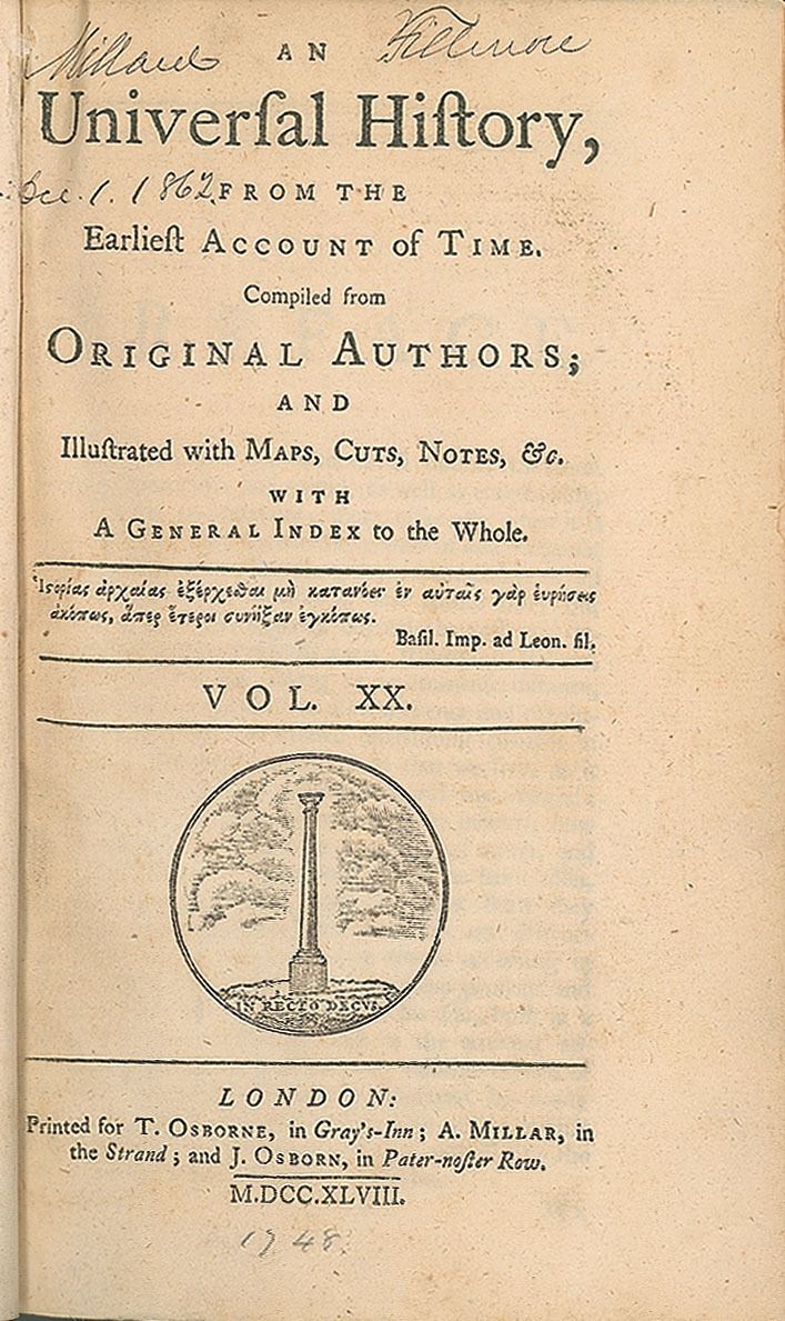 Signed book: Universal History, from the Earliest Account of Time, Vol. XX. London: T. Osborne, 1748. Rebound hardcover, 5.5 x 8.5, 555 pages. Signed on the title page in black ink with his ownership signature, "Millard Fillmore, Dec. 1, 1862." Autographic condition: fine. Book condition: VG/None, with some underlining to the text and small areas of marginal paper loss to a few pages.